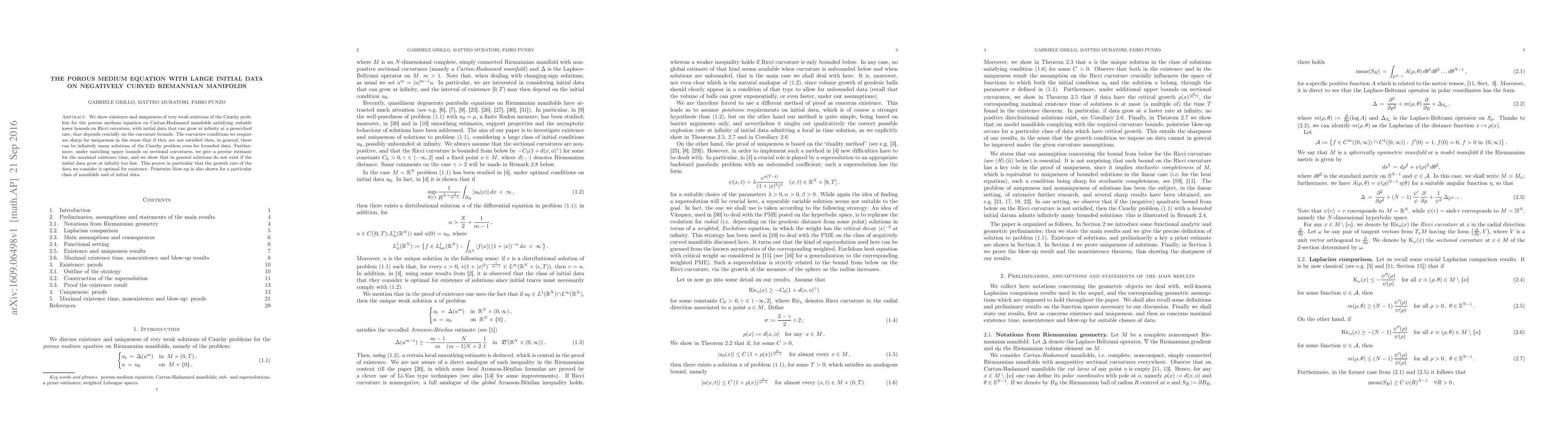 We show existence and uniqueness of very weak solutions of the Cauchy problem for the porous medium equation on Cartan-Hadamard manifolds satisfying suitable lower bounds on Ricci curvature, with initial data that can grow at infinity at a prescribed rate, that depends crucially on the curvature bounds. The curvature conditions we require are sharp for uniqueness in the sense that if they are not satisfied then, in general, there can be infinitely many solutions of the Cauchy problem even for bounded data. Furthermore, under matching upper bounds on sectional curvatures, we give a precise estimate for the maximal existence time, and we show that in general solutions do not exist if the initial data grow at infinity too fast. This proves in particular that the growth rate of the data we consider is optimal for existence. Pointwise blow-up is also shown for a particular class of manifolds and of initial data.