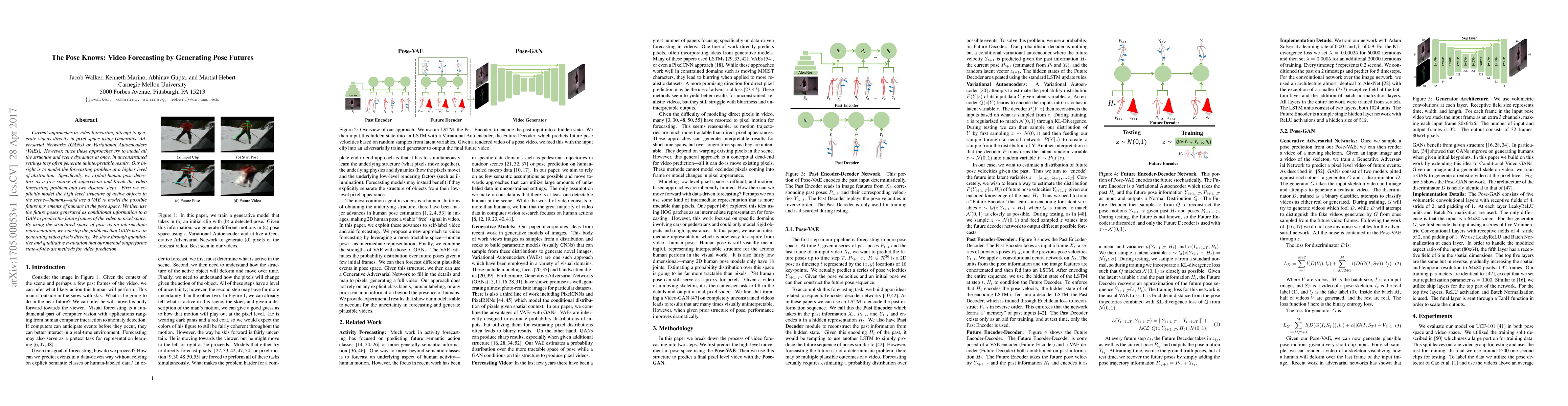 This paper proposes a video forecasting method that leverages human pose information to model future movements in a structured pose space before generating future video frames using a GAN. This two-step approach, using a VAE for pose prediction followed by a GAN for pixel-level prediction, outperforms existing methods in both quantitative and qualitative evaluations.