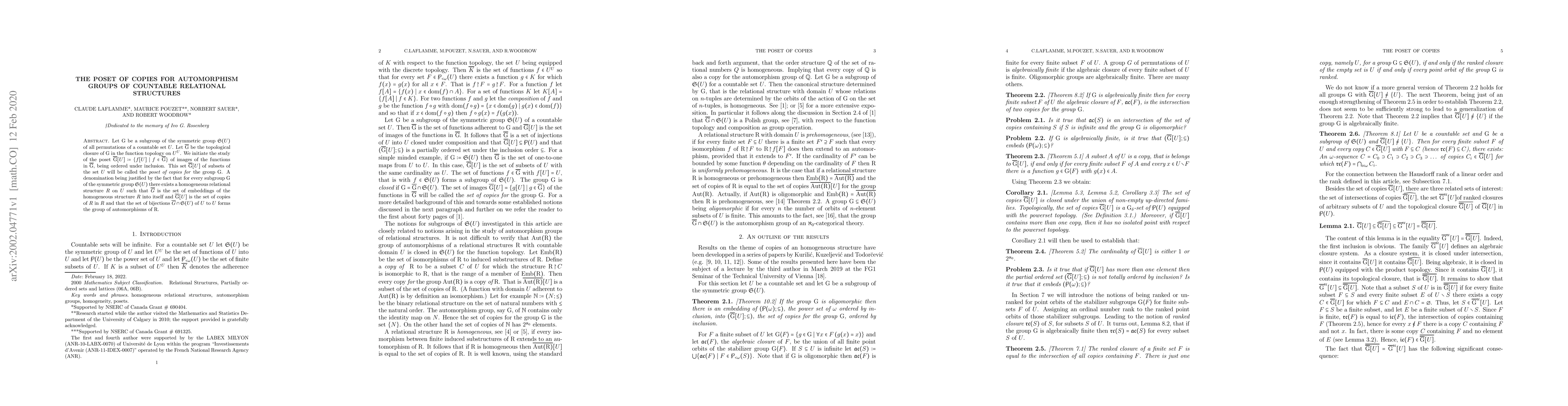 Let $\mathrm{G}$ be a subgroup of the symmetric group $\mathfrak S(U)$ of all permutations of a countable set $U$. Let $\overline{\mathrm{G}}$ be the topological closure of $\mathrm{G}$ in the function topology on $U^U$. We initiate the study of the poset $\overline{\mathrm{G}}[U]:=\{f[U]\mid f\in \overline{\mathrm{G}}\}$ of images of the functions in $\overline{\mathrm{G}}$, being ordered under inclusion. This set $\overline{\mathrm{G}}[U]$ of subsets of the set $U$ will be called the \emph{poset of copies for} the group $\mathrm{G}$. A denomination being justified by the fact that for every subgroup $\mathrm{G}$ of the symmetric group $\mathfrak S(U)$ there exists a homogeneous relational structure $R$ on $U$ such that $\overline G$ is the set of embeddings of the homogeneous structure $R$ into itself and $\overline{\mathrm{G}}[U]$ is the set of copies of $R$ in $R$ and that the set of bijections $\overline G\cap \mathfrak S(U)$ of $U$ to $U$ forms the group of automorphisms of $\mathrm{R}$.