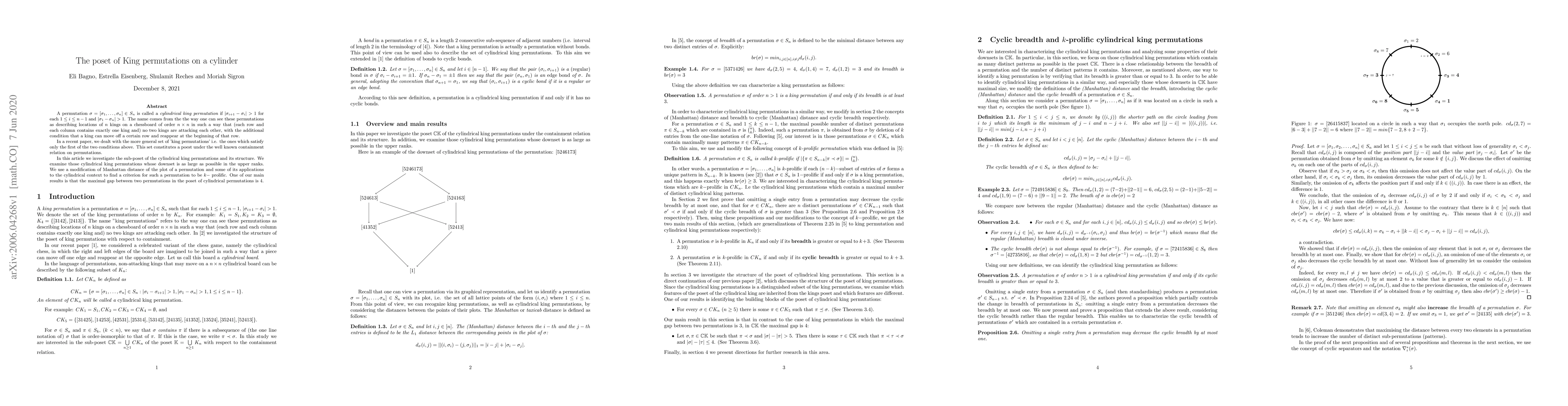This paper explores the poset of cylindrical king permutations, which describe non-attacking king placements on an $n \times n$ chessboard with wrap-around rows. It investigates the structure of this sub-poset and finds that the maximal gap between any two permutations is 4.