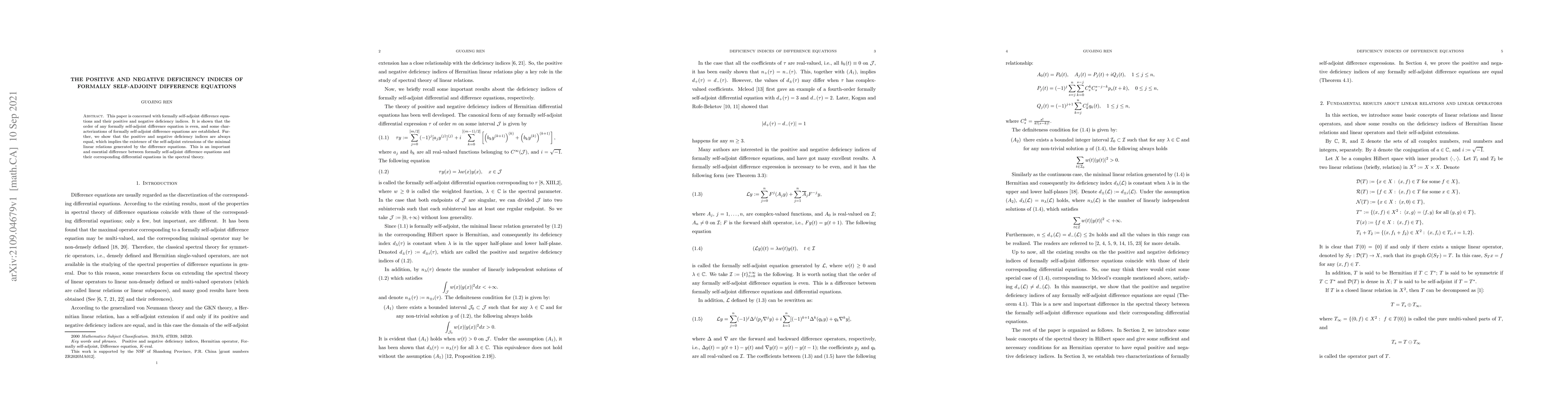 This paper investigates formally self-adjoint difference equations, proving they must have even order and equal positive and negative deficiency indices, which guarantees the existence of self-adjoint extensions, contrasting with differential equations in spectral theory.