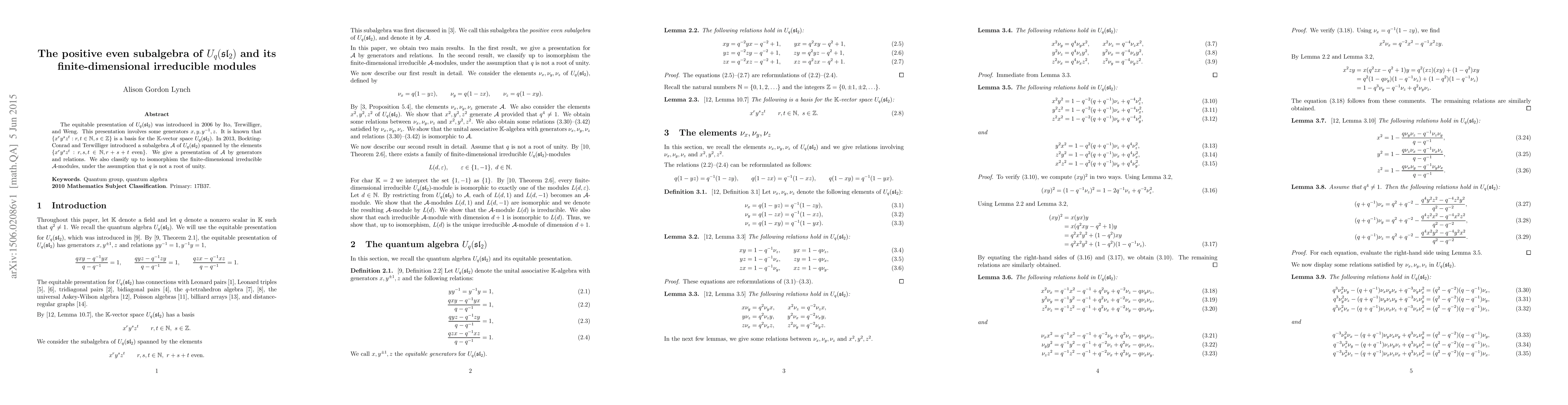 This paper presents a detailed analysis of the positive even subalgebra $\mathcal{A}$ of $U_q(\mathfrak{sl}_2)$, providing a new set of generators and relations. It classifies the finite-dimensional irreducible $\mathcal{A}$-modules when $q$ is not a root of unity.
