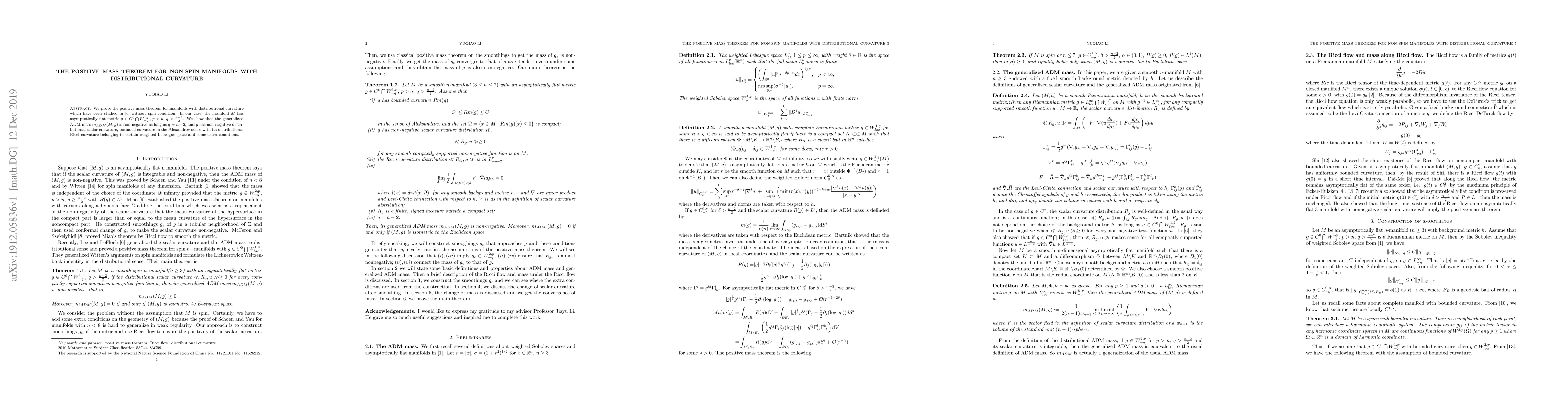 This paper proves the positive mass theorem for non-spin manifolds with distributional curvature, showing that the generalized ADM mass is non-negative under specific conditions on the metric and curvature. The conditions include an asymptotically flat metric and non-negative distributional scalar curvature.