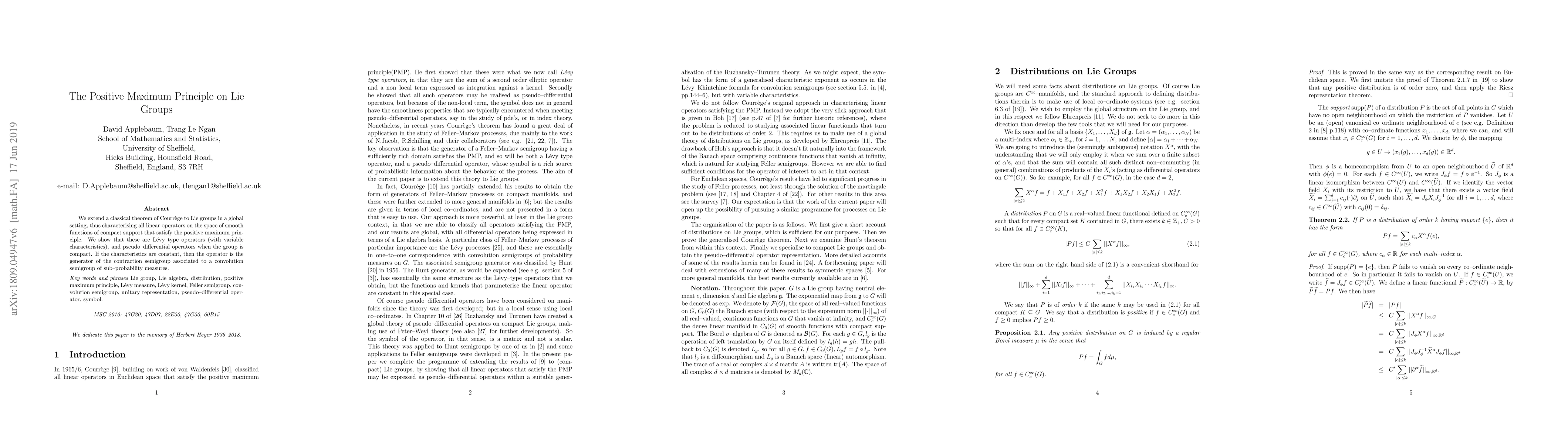 We extend a classical theorem of Courr\`{e}ge to Lie groups in a global setting, thus characterising all linear operators on the space of smooth functions of compact support that satisfy the positive maximum principle. We show that these are L\'{e}vy type operators (with variable characteristics), and pseudo--differential operators when the group is compact. If the characteristics are constant, then the operator is the generator of the contraction semigroup associated to a convolution semigroup of sub--probability measures.