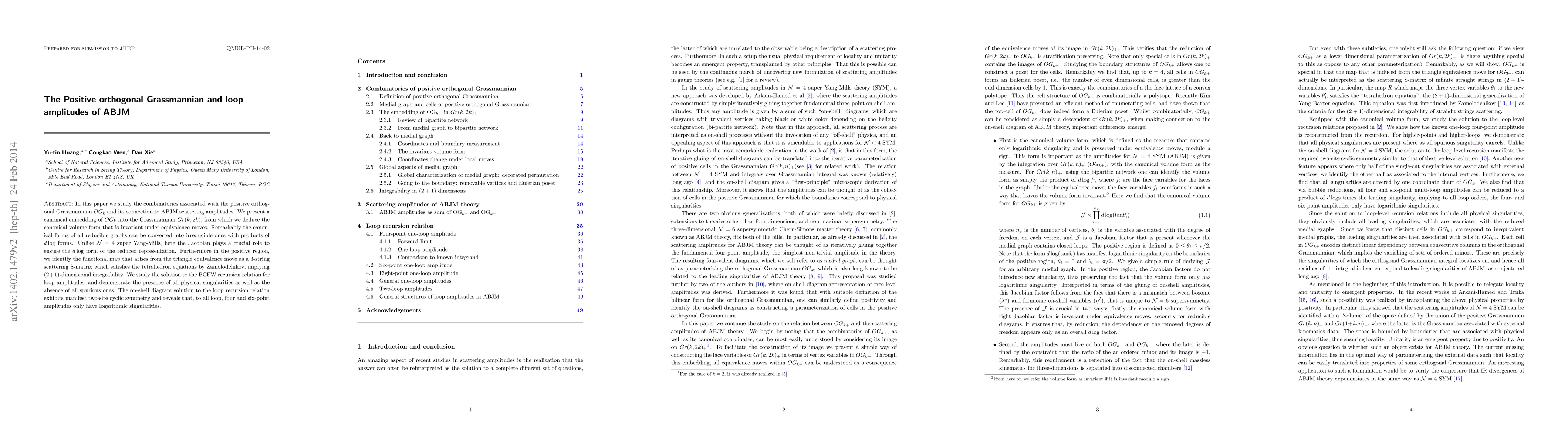 The paper presents a detailed analysis of the positive orthogonal Grassmannian OG_k and its connection to ABJM scattering amplitudes, introducing a canonical embedding and volume form invariant under equivalence moves.
