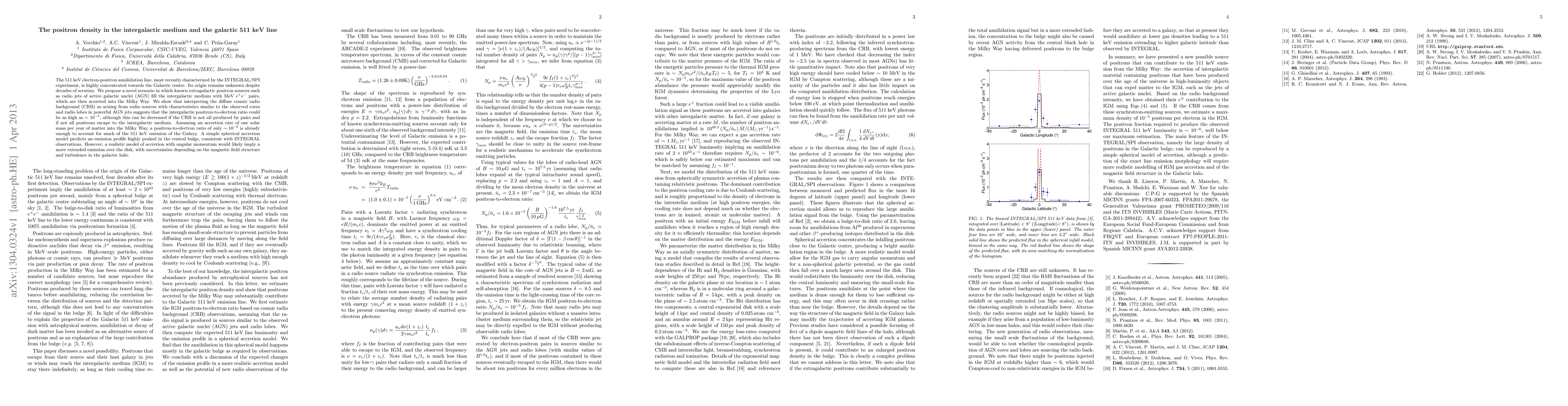 The 511 keV electron-positron annihilation line, most recently characterized by the INTEGRAL/SPI experiment, is highly concentrated towards the Galactic centre. Its origin remains unknown despite decades of scrutiny. We propose a novel scenario in which known extragalactic positron sources such as radio jets of active galactic nuclei (AGN) fill the intergalactic medium with MeV e+e- pairs, which are then accreted into the Milky Way. We show that interpreting the diffuse cosmic radio background (CRB) as arising from radio sources with characteristics similar to the observed cores and radio lobes in powerful AGN jets suggests that the intergalactic positron-to-electron ratio could be as high as 10^{-5}, although this can be decreased if the CRB is not all produced by pairs and if not all positrons escape to the intergalactic medium. Assuming an accretion rate of one solar mass per year of matter into the Milky Way, a positron-to-electron ratio of only 10^{-7} is already enough to account for much of the 511 keV emission of the Galaxy. A simple spherical accretion model predicts an emission profile highly peaked in the central bulge, consistent with INTEGRAL observations. However, a realistic model of accretion with angular momentum would likely imply a more extended emission over the disk, with uncertainties depending on the magnetic field structure and turbulence in the galactic halo.