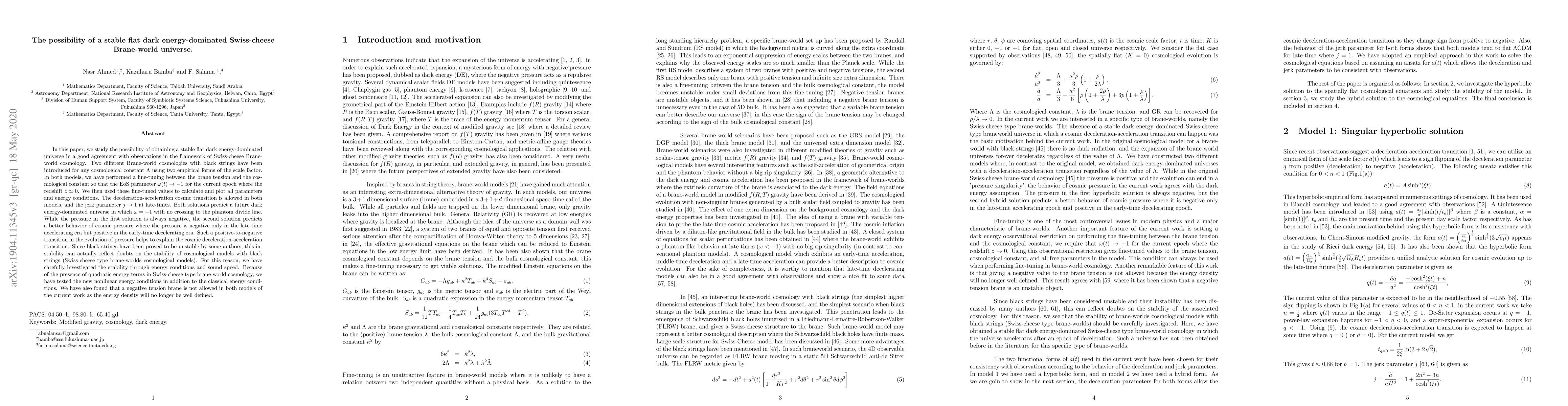 In this paper, we study the possibility of obtaining a stable flat dark energy-dominated universe in a good agreement with observations in the framework of Swiss-cheese Brane-world cosmology. Two different Brane-world cosmologies with black strings have been introduced for any cosmological constant $\Lambda$ using two empirical forms of the scale factor. In both models, we have performed a fine-tuning between the brane tension and the cosmological constant so that the EoS parameter $\omega(t)\rightarrow -1$ for the current epoch where the redshift $z\simeq 0$. We then used these fine-tuned values to calculate and plot all parameters and energy conditions. The deceleration-acceleration cosmic transition is allowed in both models, and the jerk parameter $j\rightarrow 1$ at late-times. Both solutions predict a future dark energy-dominated universe in which $\omega=-1$ with no crossing to the phantom divide line. While the pressure in the first solution is always negative, the second solution predicts a better behavior of cosmic pressure where the pressure is negative only in the late-time accelerating era but positive in the early-time decelerating era. Since black strings have been proved to be unstable by some authors, this instability can actually reflect doubts on the stability of cosmological models with black strings (Swiss-cheese type brane-worlds cosmological models). For this reason, we have carefully investigated the stability through energy conditions and sound speed. Because of the presence of quadratic energy terms in Swiss-cheese type brane-world cosmology, we have tested the new nonlinear energy conditions in addition to the classical energy conditions. We have also found that constructing non-singular and cyclic solutions through certain ansatze in Swiss-cheese Brane-worlds are not possible.