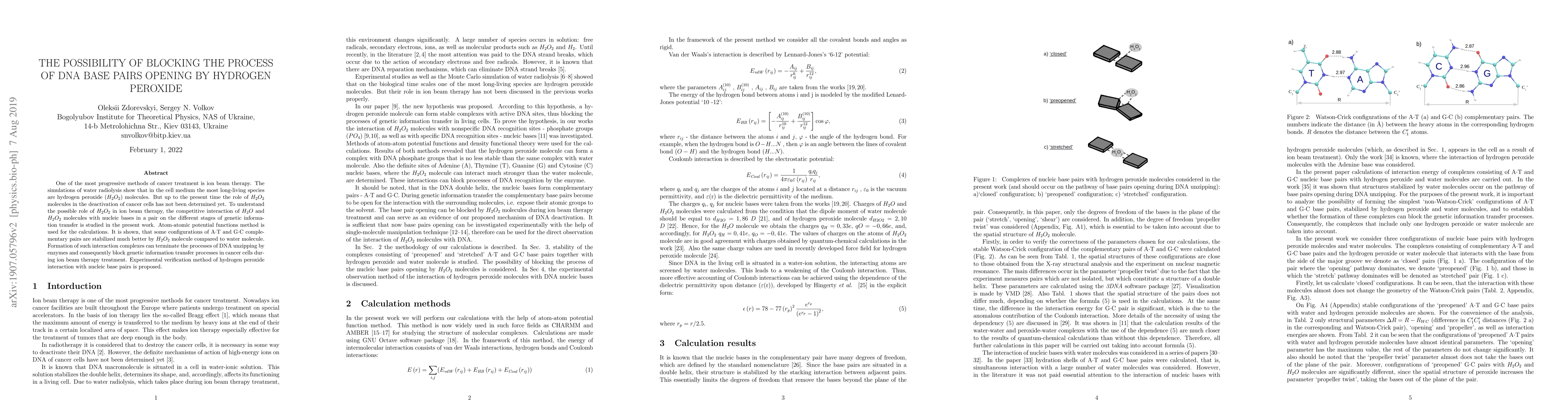 This paper investigates the potential of hydrogen peroxide (H$_2$O$_2$) to block DNA base pair opening during ion beam therapy, suggesting that H$_2$O$_2$ can stabilize complementary DNA pairs better than water, potentially halting genetic information transfer in cancer cells. An experimental method for verifying this interaction is proposed.