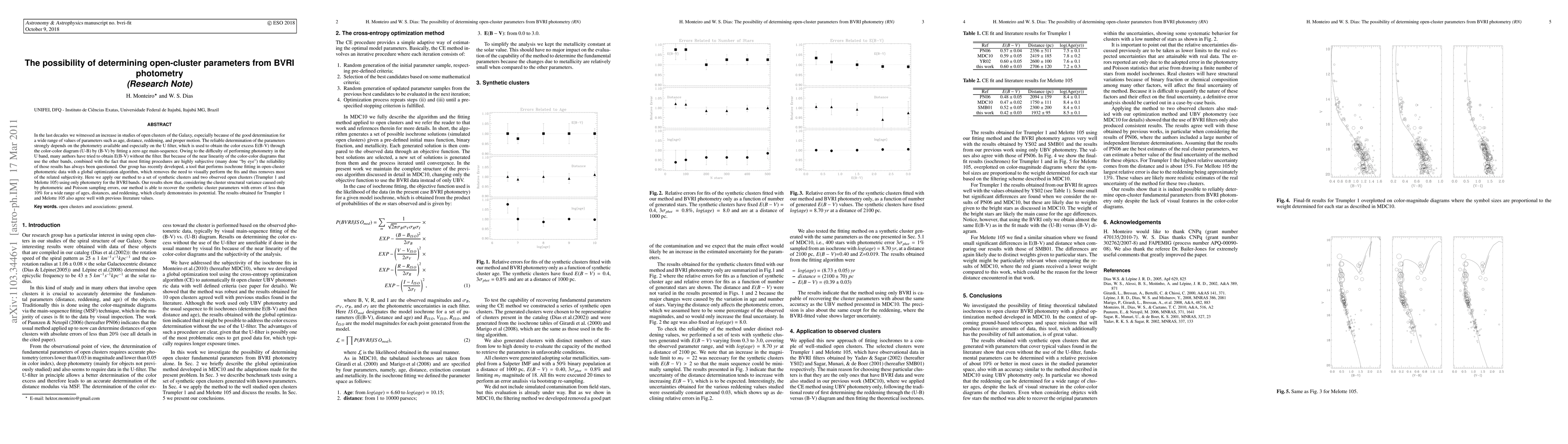 This paper presents a new method for determining open-cluster parameters using BVRI photometry without relying on the U filter, which reduces subjectivity in fitting procedures. The method, employing a global optimization algorithm, was tested on synthetic and real clusters, showing reliable recovery of parameters with errors under 10%.