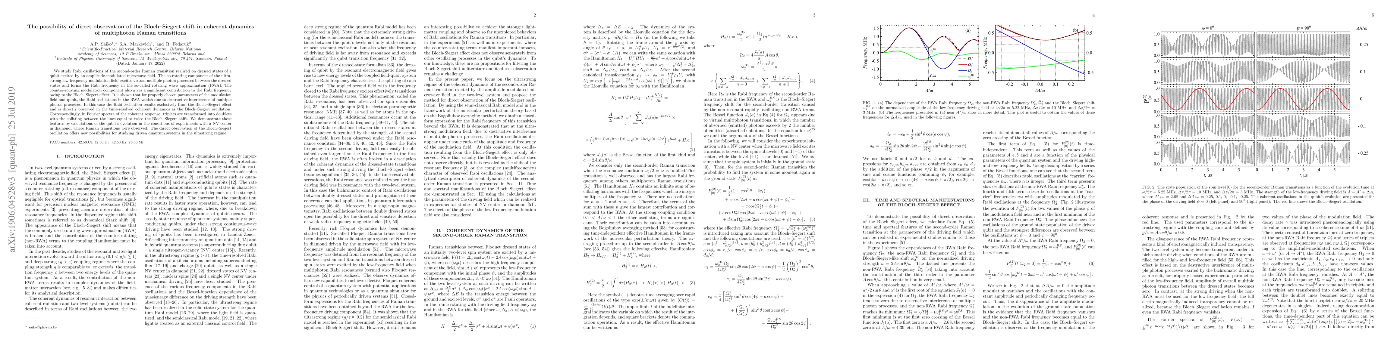 This paper investigates the direct observation of the Bloch-Siegert shift in coherent dynamics of multiphoton Raman transitions, showing that under specific conditions, the Bloch-Siegert effect dominates, leading to observable Bloch-Siegert oscillations.