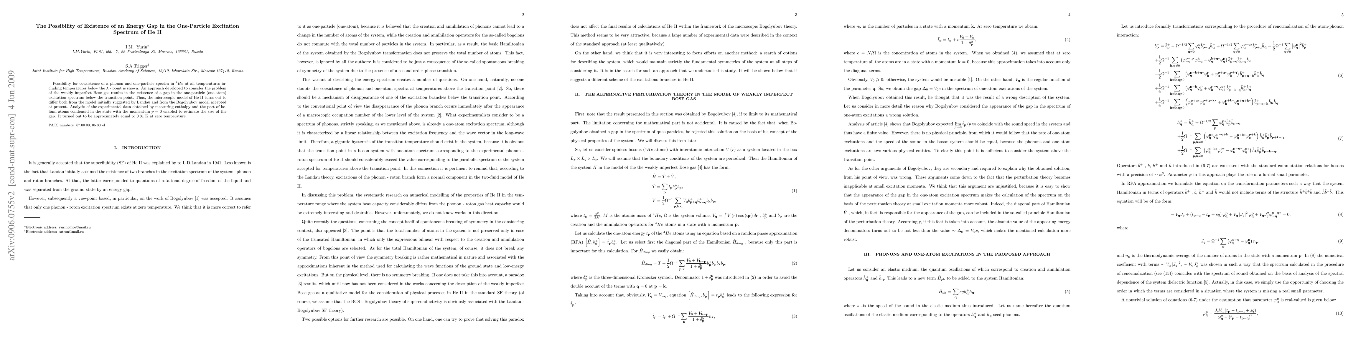 Possibility for coexistence of a phonon and one-particle spectra in ${}^4He$ at all temperatures including temperatures below the $\lambda$ - point is shown. An approach developed to consider the problem of the weakly imperfect Bose gas results in the existence of a gap in the one-particle (one-atom) excitation spectrum below the transition point. Thus, the microscopic model of He II turns out to differ both from the model initially suggested by Landau and from the Bogolyubov model accepted at present. Analysis of the experimental data obtained by measuring enthalpy and the part of helium atoms condensed in the state with the momentum $p=0$ enabled to estimate the size of the gap. It turned out to be approximately equal to 0.31 K at zero temperature.