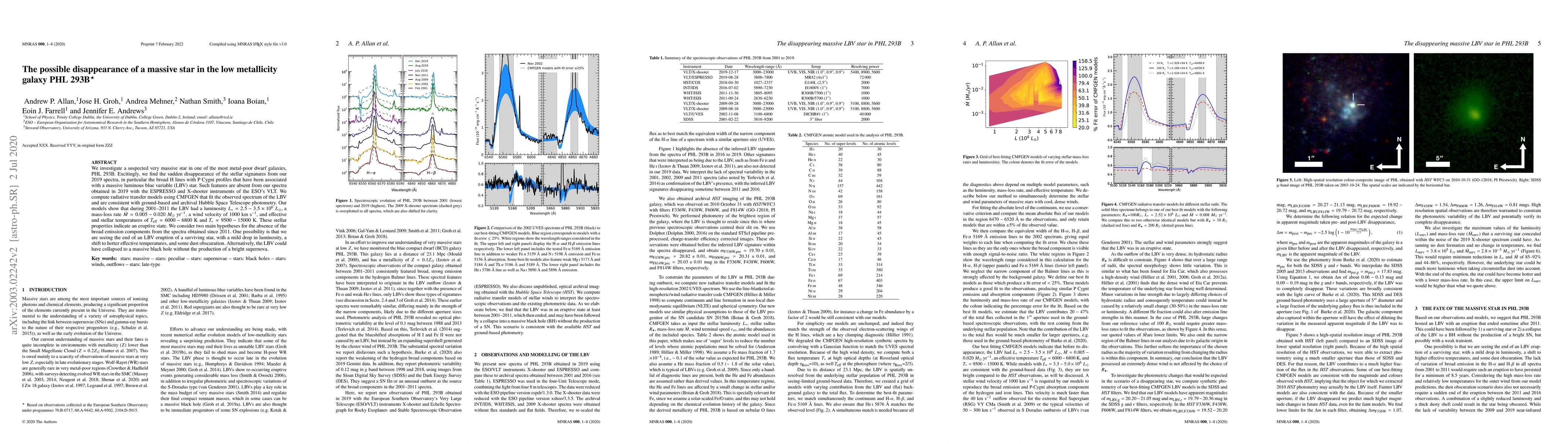 Research on PHL 293B, a low metallicity galaxy, reveals the sudden vanishing of a suspected massive star's spectral signatures from 2019. Utilizing CMFGEN models, the star was previously identified as a luminous blue variable (LBV) with specific properties indicating an eruptive state between 2001-2011. The study now considers two hypotheses: either the LBV is transitioning to a cooler, less luminous phase with dust obscuration, or it has collapsed into a massive black hole without a supernova.
