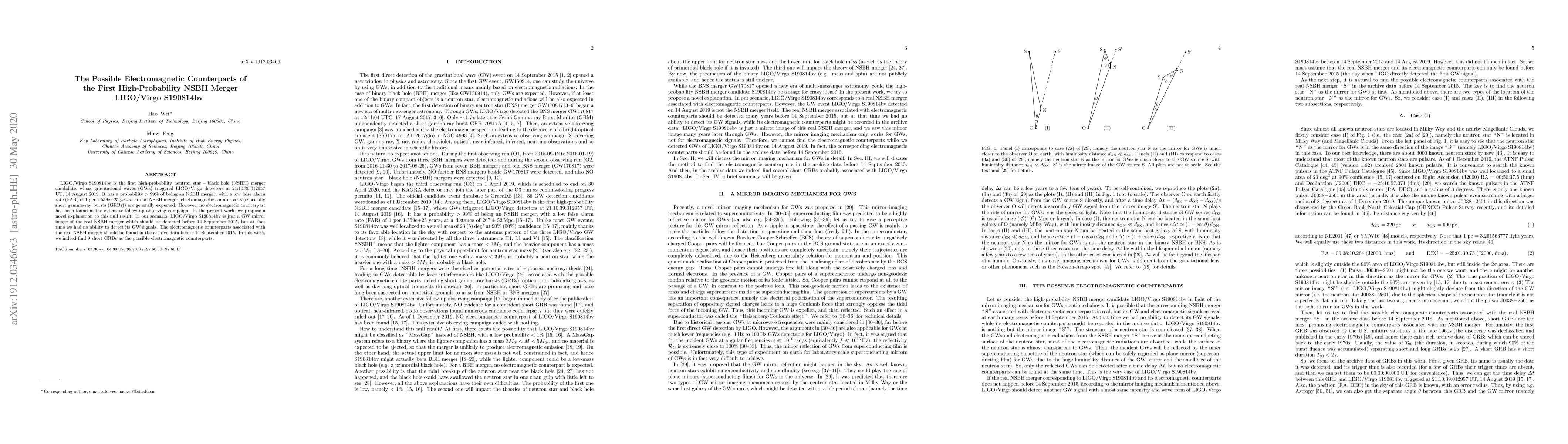 This paper discusses the first high-probability neutron star-black hole merger detected by LIGO/Virgo, S190814bv, and proposes a novel explanation for the absence of electromagnetic counterparts. The authors suggest that S190814bv is a GW mirror image of a real NSBH merger, which occurred before 14 September 2015, and found 9 short GRBs in archival data as potential electromagnetic counterparts.