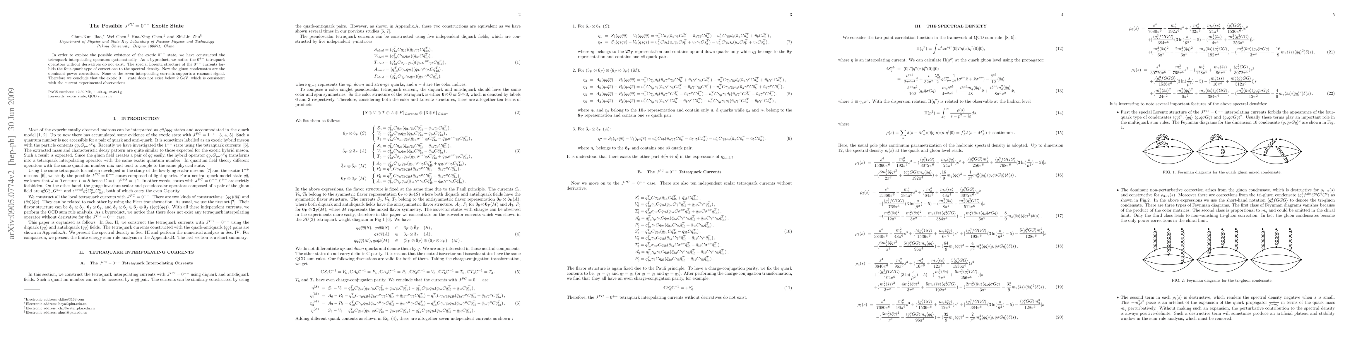 In order to explore the possible existence of the exotic $0^{--}$ state, we have constructed the tetraquark interpolating operators systematically. As a byproduct, we notice the $0^{+-}$ tetraquark operators without derivatives do not exist. The special Lorentz structure of the $0^{--}$ currents forbids the four-quark correction to the spectral density. Now the gluon condensate is the dominant power correction. Within the framework of the finite energy sum rule, none of the seven interpolating currents supports a resonant signal. Therefore we conclude that the exotic $0^{--}$ state does not exist below 2 GeV, which is consistent with the current experimental observations.