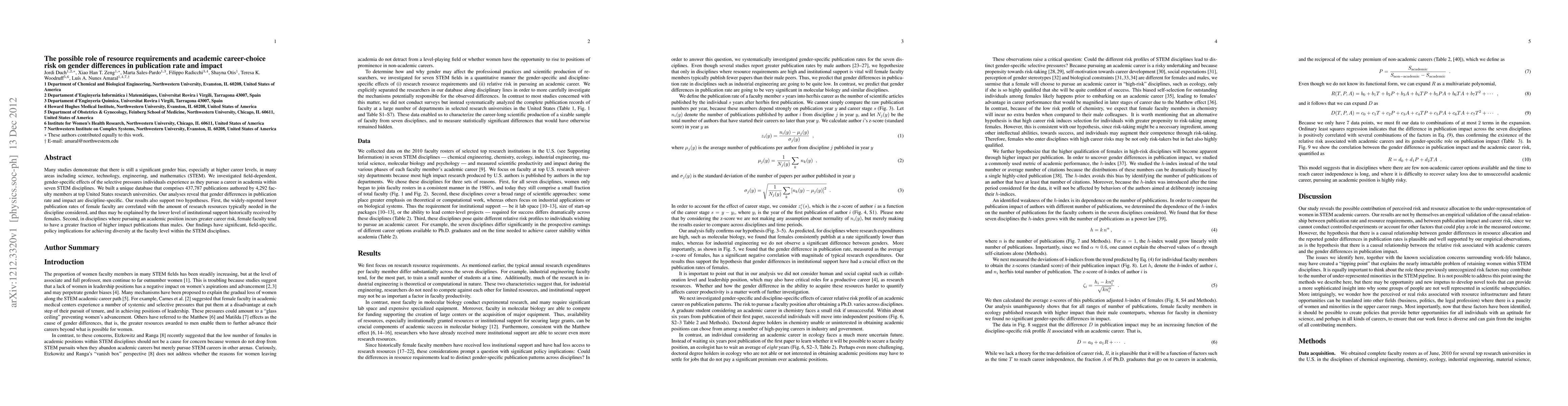 This study examines gender differences in publication rates and impact in STEM disciplines, finding that lower female faculty publication rates correlate with higher resource requirements and greater career risk, suggesting historical institutional support disparities and highlighting the need for field-specific diversity policies.