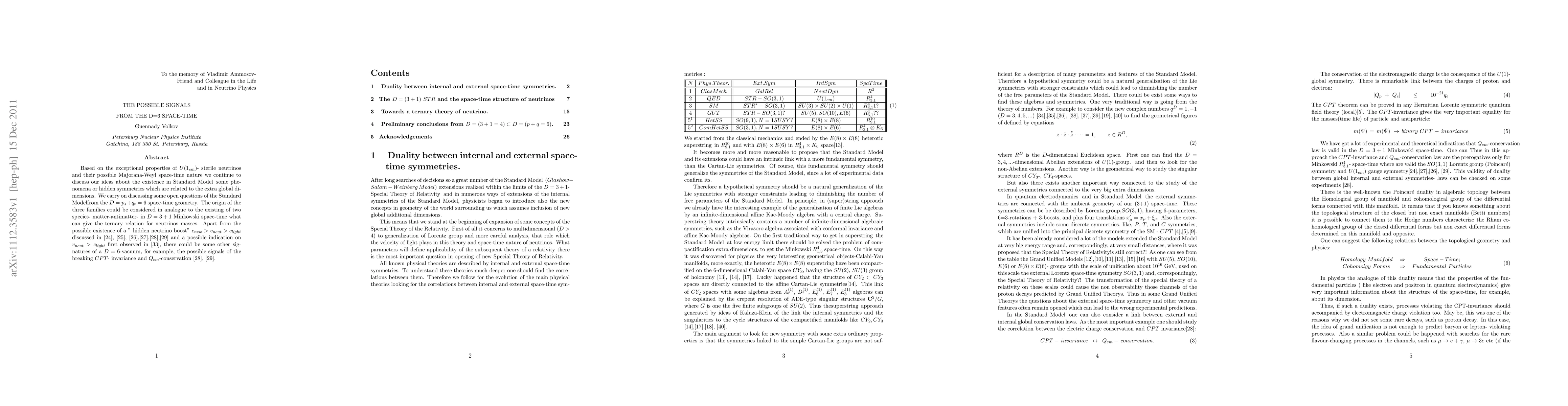Based on the exceptional properties of U(1)_{em}-sterile neutrinos and their possible Majorana-Weyl space-time nature we continue to discuss our ideas about the existence in Standard Model some phenomena or hidden symmetries which are related to the extra global dimensions. We carry on discussing some open questions of the SM from the D=p_s+q_t=6 space-time geometry. The origin of the three families could be considered in analogue to the existing of two species- matter-antimatter in D=3+1 Minkowski space-time what can give the ternary relation for neutrinos masses. Apart from the possible existence of a "hidden neutrino boost" c_{new}> v_{neut} > c_{light} discussed in previous papers and a possible indication on v_{neut} > c_{light} first observed in OPERA2011 there could be some other signatures of a D=6-vacuum, for example, the possible signals of the breaking CPT-invariance and Q_{em}-conservation.