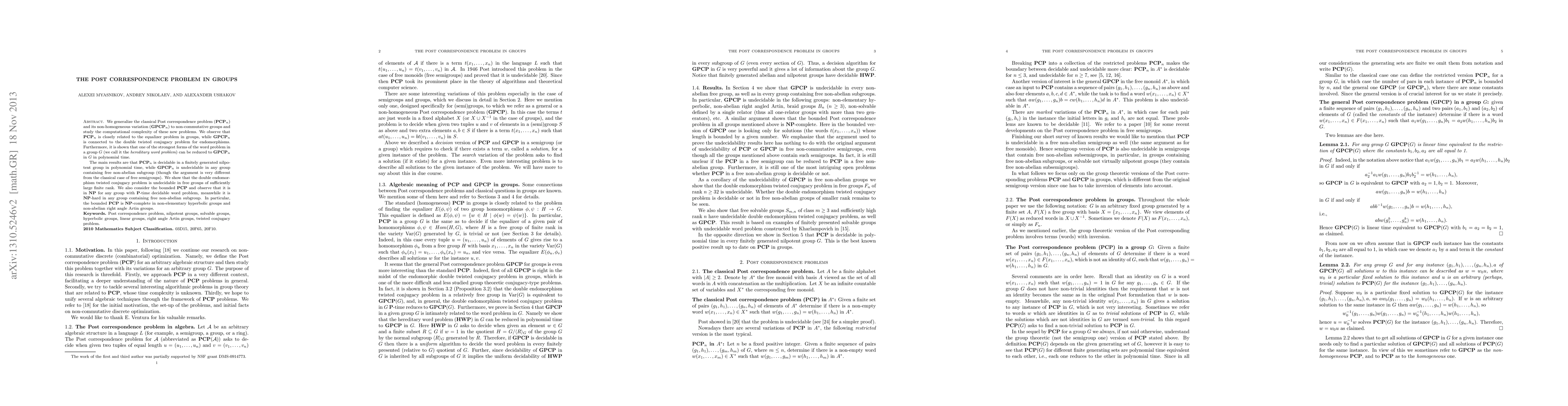 This research generalizes the Post correspondence problem to non-commutative groups, linking it to the equalizer problem and double twisted conjugacy problem. Key findings include polynomial-time decidability of the problem in finitely generated nilpotent groups, undecidability in groups with free non-abelian subgroups, and NP-completeness of the bounded version in certain group classes like non-elementary hyperbolic groups and non-abelian right-angle Artin groups.