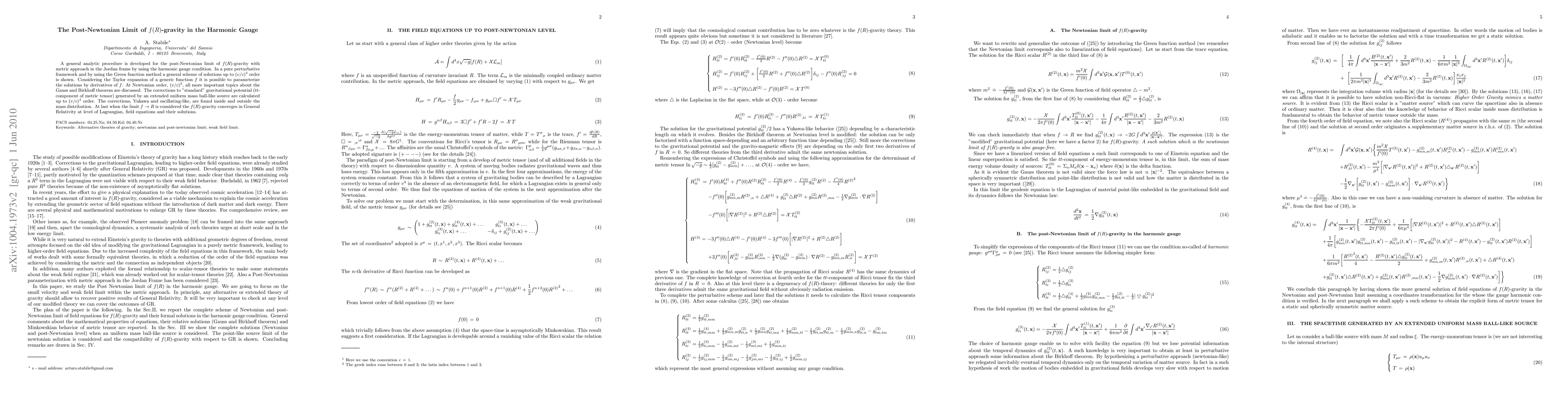 This paper develops an analytic method to derive the post-Newtonian limit of $f(R)$-gravity in the harmonic gauge, showing solutions up to $(v/c)^4$ order. The study calculates corrections to the gravitational potential in extended mass distributions, revealing Yukawa and oscillating corrections, and shows convergence to General Relativity as $f$ approaches $R$.