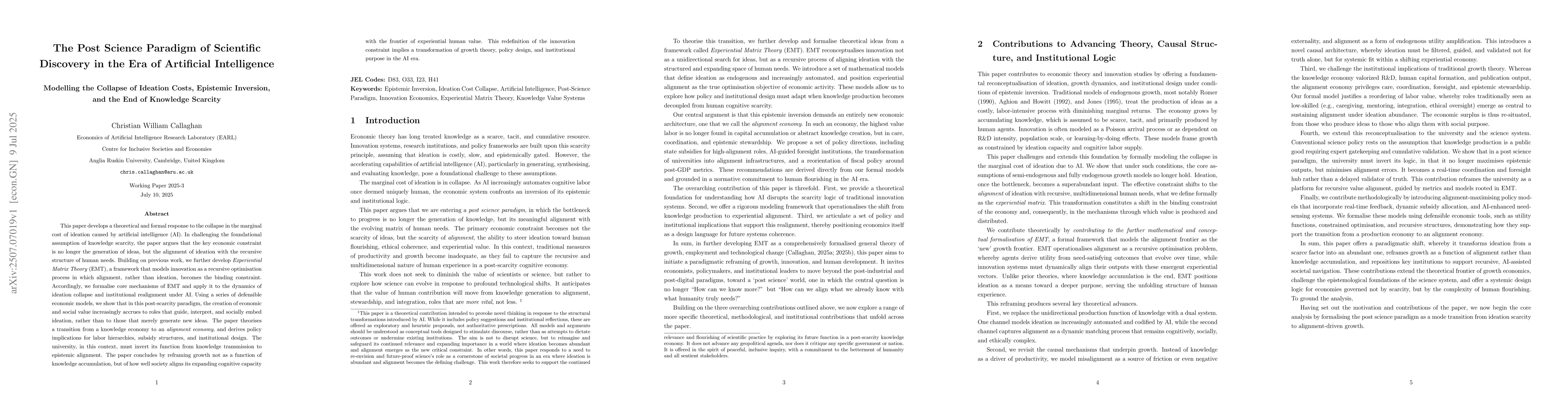 This paper develops a theoretical and formal response to the collapse in the marginal cost of ideation caused by artificial intelligence (AI). In challenging the foundational assumption of knowledge scarcity, the paper argues that the key economic constraint is no longer the generation of ideas, but the alignment of ideation with the recursive structure of human needs. Building on previous work, we further develop Experiential Matrix Theory (EMT), a framework that models innovation as a recursive optimisation process in which alignment, rather than ideation, becomes the binding constraint. Accordingly, we formalise core mechanisms of EMT and apply it to the dynamics of ideation collapse and institutional realignment under AI. Using a series of defensible economic models, we show that in this post-scarcity paradigm, the creation of economic and social value increasingly accrues to roles that guide, interpret, and socially embed ideation, rather than to those that merely generate new ideas. The paper theorises a transition from a knowledge economy to an alignment economy, and derives policy implications for labor hierarchies, subsidy structures, and institutional design. The university, in this context, must invert its function from knowledge transmission to epistemic alignment. The paper concludes by reframing growth not as a function of knowledge accumulation, but of how well society aligns its expanding cognitive capacity with the frontier of experiential human value. This redefinition of the innovation constraint implies a transformation of growth theory, policy design, and institutional purpose in the AI era.