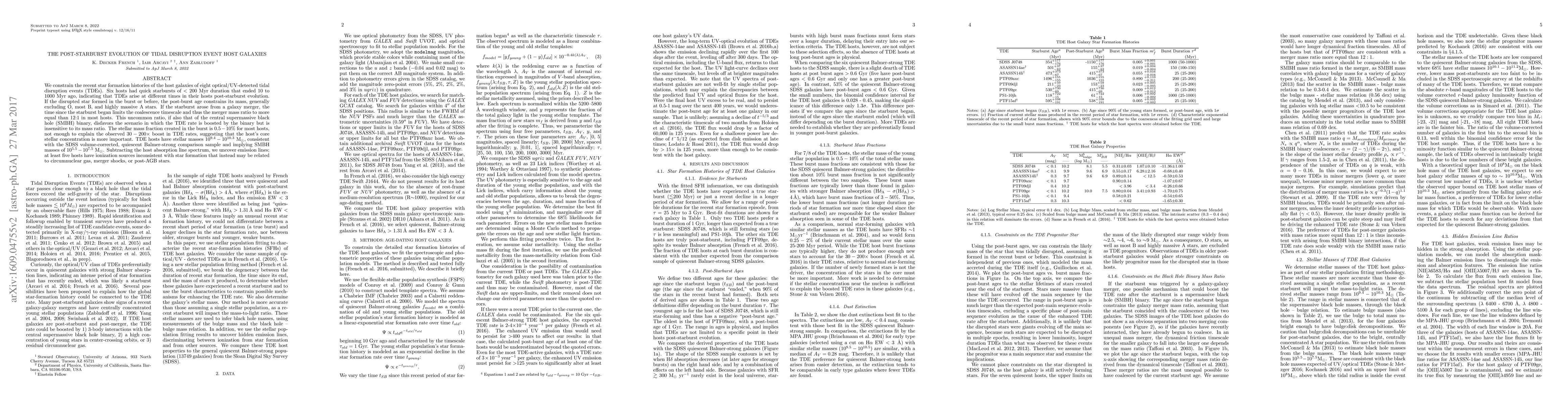 Research finds that host galaxies of tidal disruption events have quick starbursts that ended 10-1000 Myr ago, suggesting TDEs occur at different stages in their evolution, and that the rate of TDEs is more related to stellar mass concentration than binary black hole mergers.