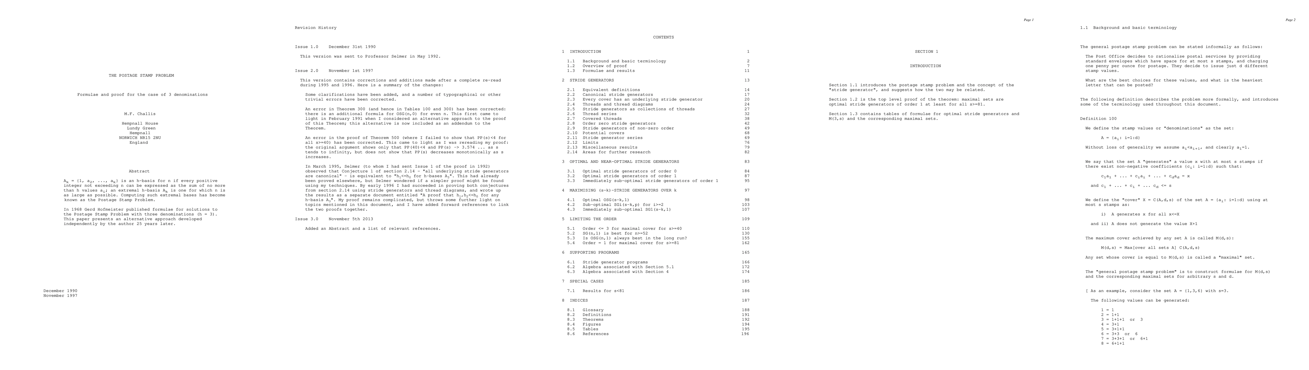 A_k = {1, a_2, ..., a_k} is an h-basis for n if every positive integer not exceeding n can be expressed as the sum of no more than h values a_i; an extremal h-basis A_k is one for which n is as large as possible. Computing such extremal bases has become known as the Postage Stamp Problem. In 1968 Gerd Hofmeister published formulae for solutions to the Postage Stamp Problem with three denominations (h = 3). This paper presents an alternative approach developed independently by the author 25 years later.