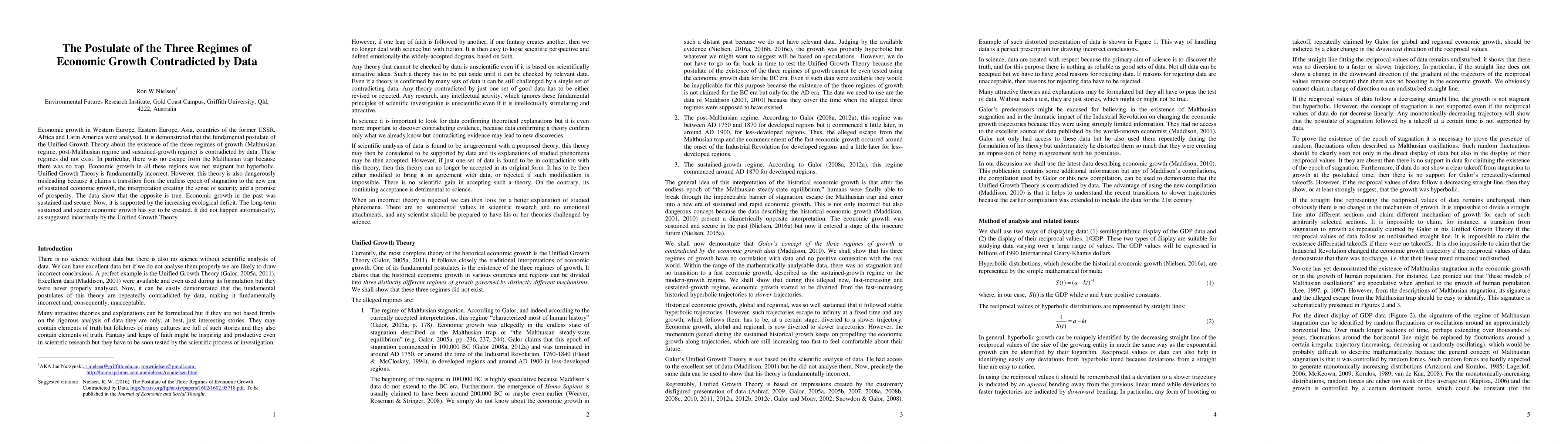 Economic growth in Western Europe, Eastern Europe, Asia, countries of the former USSR, Africa and Latin America were analysed. It is demonstrated that the fundamental postulate of the Unified Growth Theory about the existence of the three regimes of growth (Malthusian regime, post-Malthusian regime and sustained-growth regime) is contradicted by data. These regimes did not exist. In particular, there was no escape from the Malthusian trap because there was no trap. Economic growth in all these regions was not stagnant but hyperbolic. Unified Growth Theory is fundamentally incorrect. However, this theory is also dangerously misleading because it claims a transition from the endless epoch of stagnation to the new era of sustained economic growth, the interpretation creating the sense of security and a promise of prosperity. The data show that the opposite is true. Economic growth in the past was sustained and secure. Now, it is supported by the increasing ecological deficit. The long-term sustained and secure economic growth has yet to be created. It did not happen automatically, as suggested incorrectly by the Unified Growth Theory.