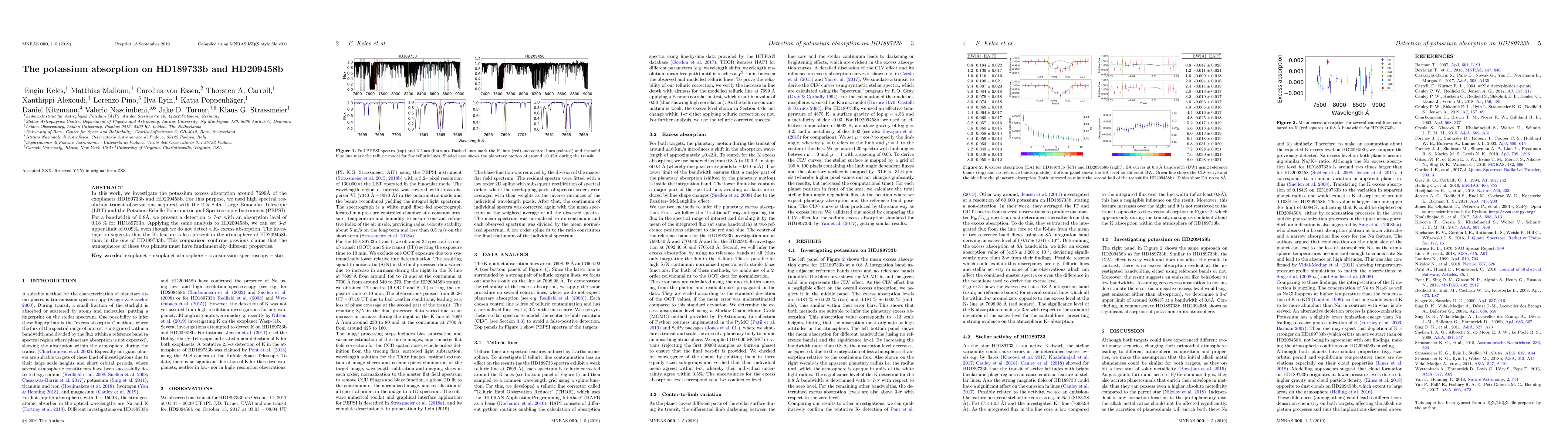 This study detects potassium absorption in the atmosphere of HD189733b with a 7-sigma significance, while setting a 3-sigma upper limit for HD209458b, indicating a less prominent K-feature in the latter. This suggests fundamental differences in the atmospheric compositions of the two exoplanets.