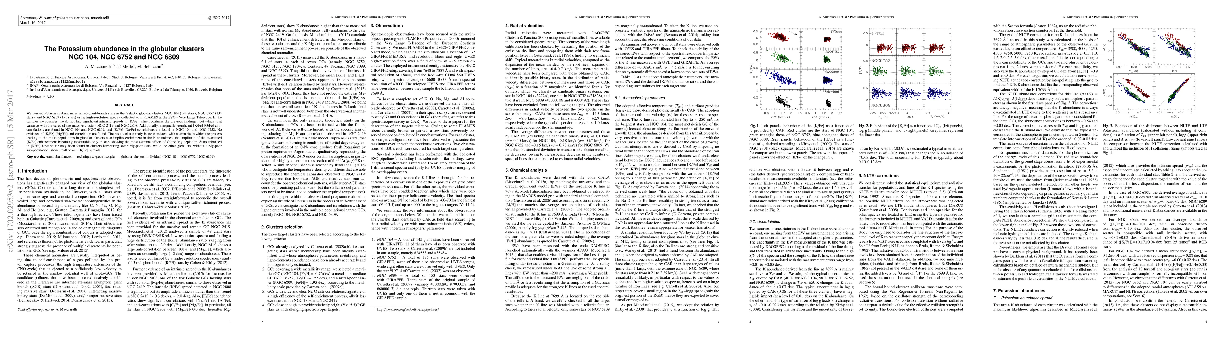 We derived Potassium abundances in red giant branch stars in the Galactic globular clusters NGC104 (144 stars), NGC6752 (134 stars) and NGC6809 (151 stars) using high-resolution spectra collected with FLAMES at the ESO - Very Large Telescope. In the considered samples we do not find significant intrinsic spreads in [K/Fe] (confirming the previous findings by Carretta et al.), at variance with the cases of the massive clusters NGC2419 and NGC2808. Additionally, marginally significant [K/Fe]-[O/Fe] anti-correlations are found in NGC104 and NGC6809, and [K/Fe]-[Na/Fe] correlations are found in NGC104 and NGC6752. No evidence of [K/Fe]-[Mg/Fe] anti-correlation are found. The results of our analysis are consistent with a scenario in which the process leading to the multi-populations in globular clusters implies also enrichment in the K abundance, the amplitude of the associated [K/Fe] enhancement becoming measurable only in stars showing the most extreme effects of O and Mg depletion. Stars enhanced in [K/Fe] have been found so far only in clusters harbouring some Mg-poor stars, while the other globulars, without a Mg-poor sub-population, show small or null [K/Fe] spreads.