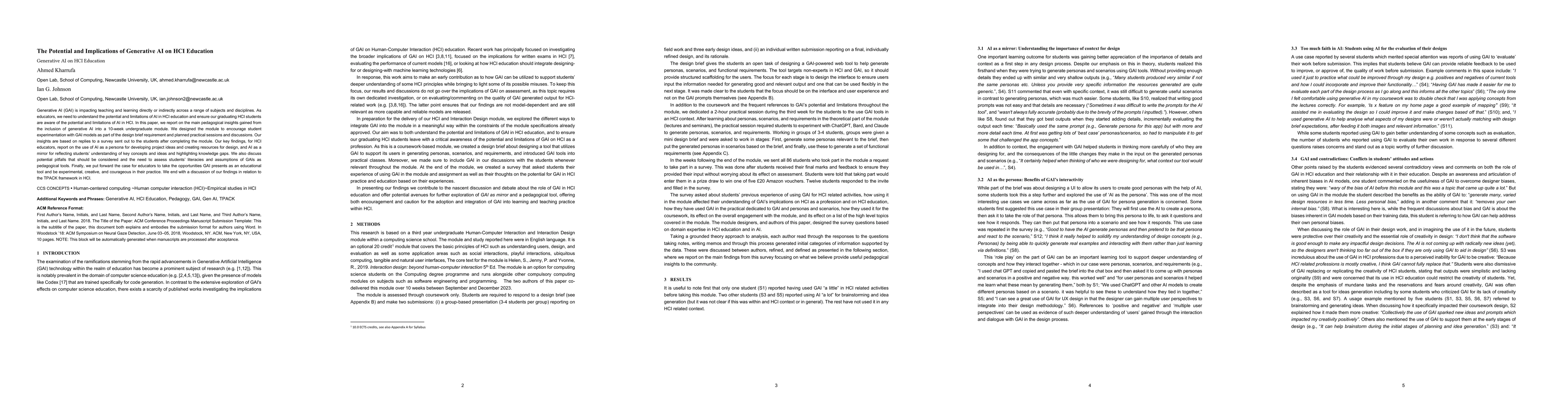 Generative AI (GAI) is impacting teaching and learning directly or indirectly across a range of subjects and disciplines. As educators, we need to understand the potential and limitations of AI in HCI education and ensure our graduating HCI students are aware of the potential and limitations of AI in HCI. In this paper, we report on the main pedagogical insights gained from the inclusion of generative AI into a 10 week undergraduate module. We designed the module to encourage student experimentation with GAI models as part of the design brief requirement and planned practical sessions and discussions. Our insights are based on replies to a survey sent out to the students after completing the module. Our key findings, for HCI educators, report on the use of AI as a persona for developing project ideas and creating resources for design, and AI as a mirror for reflecting students' understanding of key concepts and ideas and highlighting knowledge gaps. We also discuss potential pitfalls that should be considered and the need to assess students' literacies and assumptions of GAIs as pedagogical tools. Finally, we put forward the case for educators to take the opportunities GAI presents as an educational tool and be experimental, creative, and courageous in their practice. We end with a discussion of our findings in relation to the TPACK framework in HCI.