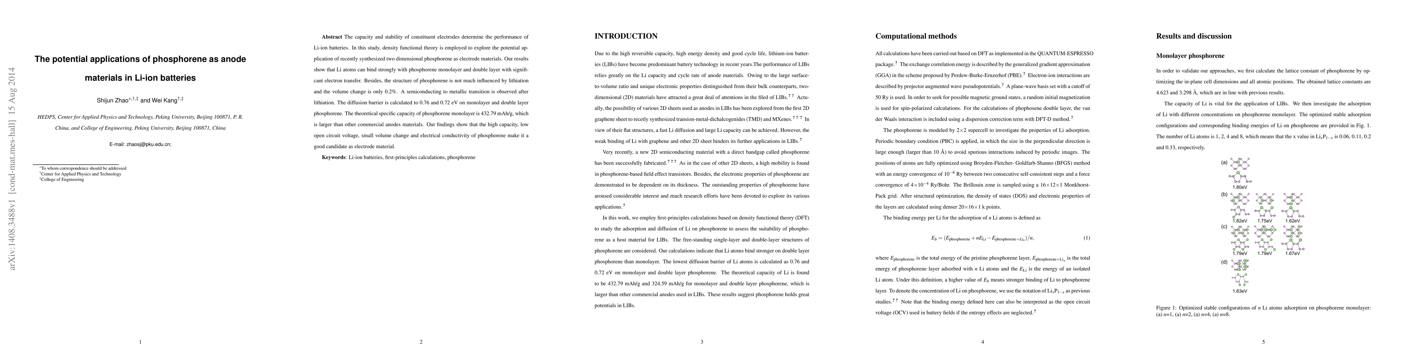 Researchers investigated phosphorene as a new anode material for Li-ion batteries, finding it offers high capacity, low volume change, and electrical conductivity, making it a promising candidate.