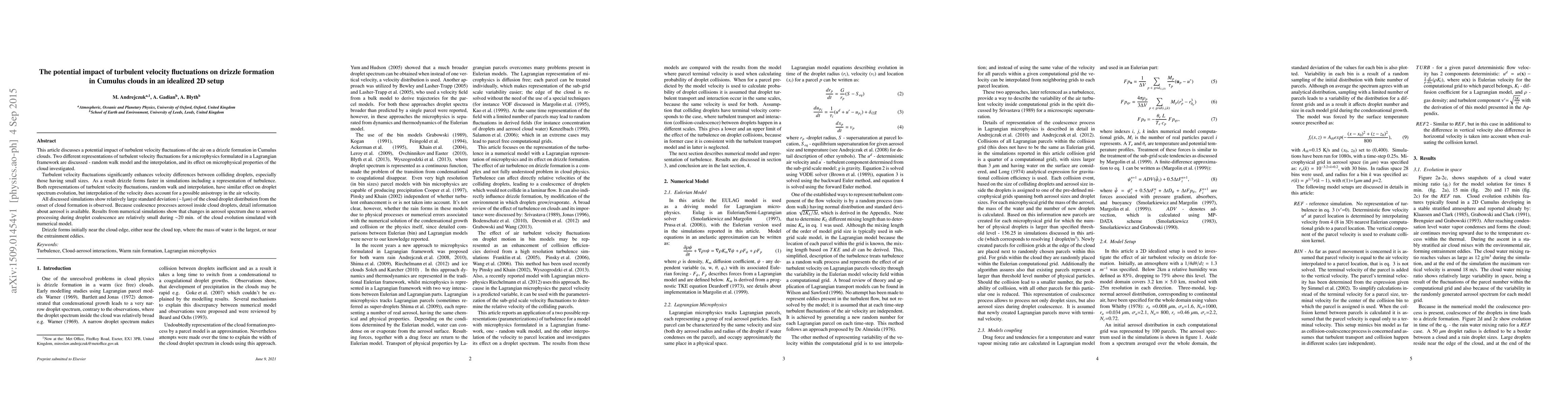 This article discusses a potential impact of turbulent velocity fluctuations of the air on a drizzle formation in Cumulus clouds. Two different representations of turbulent velocity fluctuations for a microphysics formulated in a Lagrangian framework are discussed - random walk model and the interpolation, and its effect on microphysical properties of the cloud investigated. Turbulent velocity fluctuations significantly enhances velocity differences between colliding droplets, especially those having small sizes. As a result drizzle forms faster in simulations including a representation of turbulence. Both representations of turbulent velocity fluctuations, random walk and interpolation, have similar effect on droplet spectrum evolution, but interpolation of the velocity does account for a possible anisotropy in the air velocity. All discussed simulations show relatively large standard deviation ($\sim$1${\mu}m$) of the cloud droplet distribution from the onset of cloud formation is observed. Because coalesence processes aerosol inside cloud droplets, detail information about aerosol is available. Results from numerical simulations show that changes in aerosol spectrum due to aerosol processing during droplet coalescence are relatively small during $\sim$20 min. of the cloud evolution simulated with numerical model. Drizzle forms initially near the cloud edge, either near the cloud top, where the mass of water is the largest, or near the entrainment eddies.