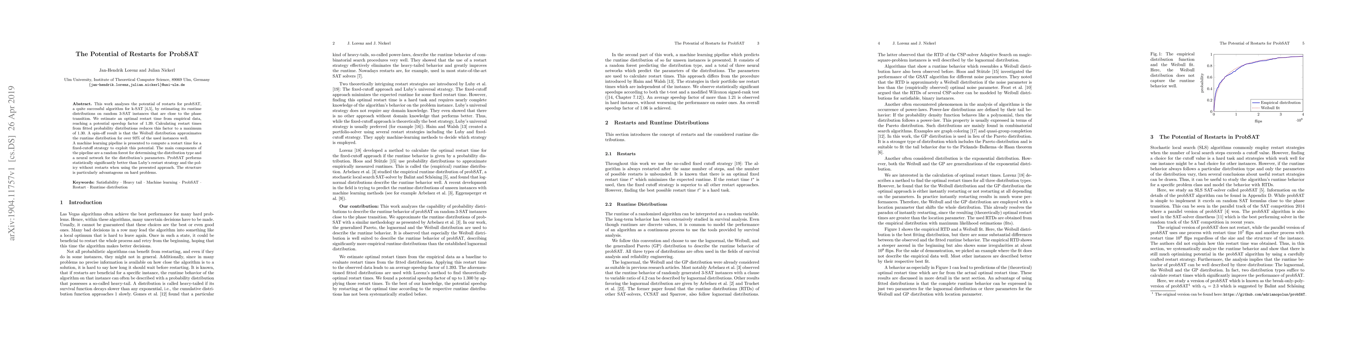 This work analyses the potential of restarts for probSAT, a quite successful algorithm for k-SAT, by estimating its runtime distributions on random 3-SAT instances that are close to the phase transition. We estimate an optimal restart time from empirical data, reaching a potential speedup factor of 1.39. Calculating restart times from fitted probability distributions reduces this factor to a maximum of 1.30. A spin-off result is that the Weibull distribution approximates the runtime distribution for over 93% of the used instances well. A machine learning pipeline is presented to compute a restart time for a fixed-cutoff strategy to exploit this potential. The main components of the pipeline are a random forest for determining the distribution type and a neural network for the distribution's parameters. ProbSAT performs statistically significantly better than Luby's restart strategy and the policy without restarts when using the presented approach. The structure is particularly advantageous on hard problems.