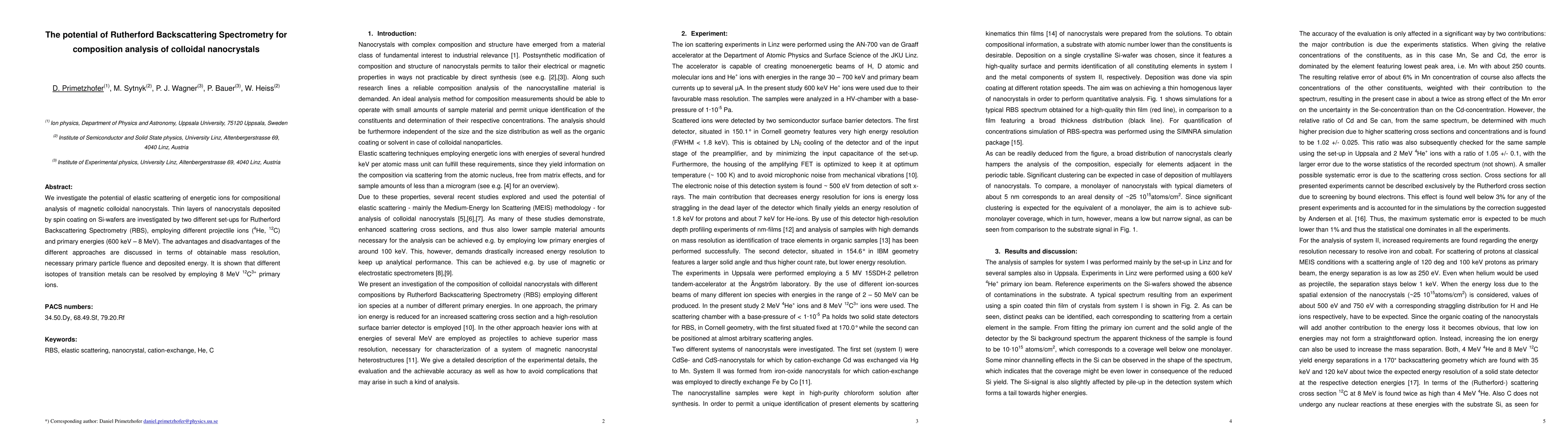 This paper explores the use of Rutherford Backscattering Spectrometry (RBS) for compositional analysis of magnetic colloidal nanocrystals, comparing different RBS setups with varying projectile ions and energies. It demonstrates that high-energy 12C3+ ions provide superior mass resolution for distinguishing different transition metal isotopes.
