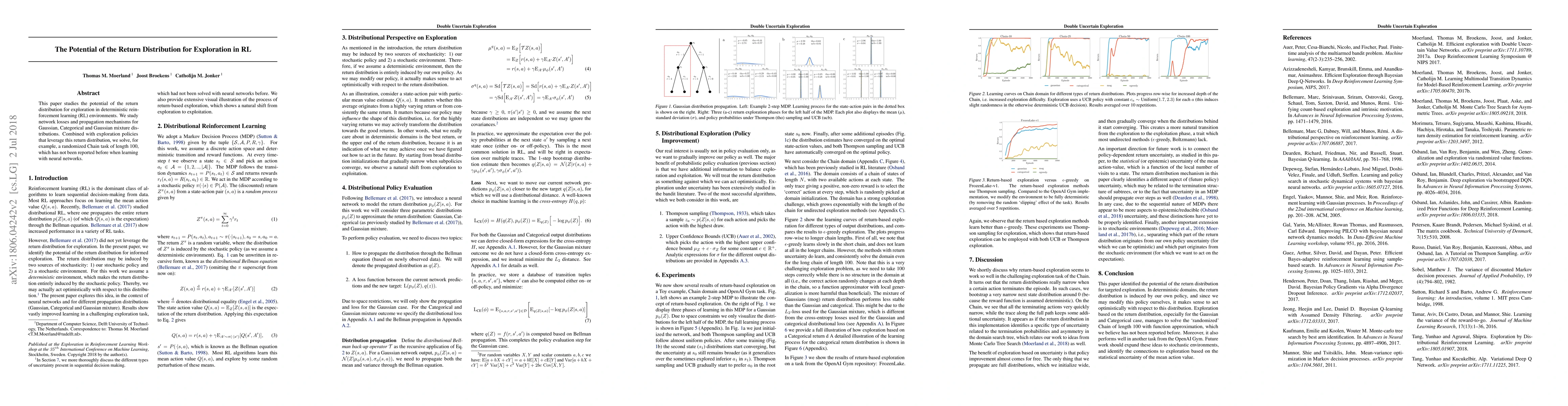 This paper studies the potential of the return distribution for exploration in deterministic reinforcement learning (RL) environments. We study network losses and propagation mechanisms for Gaussian, Categorical and Gaussian mixture distributions. Combined with exploration policies that leverage this return distribution, we solve, for example, a randomized Chain task of length 100, which has not been reported before when learning with neural networks.