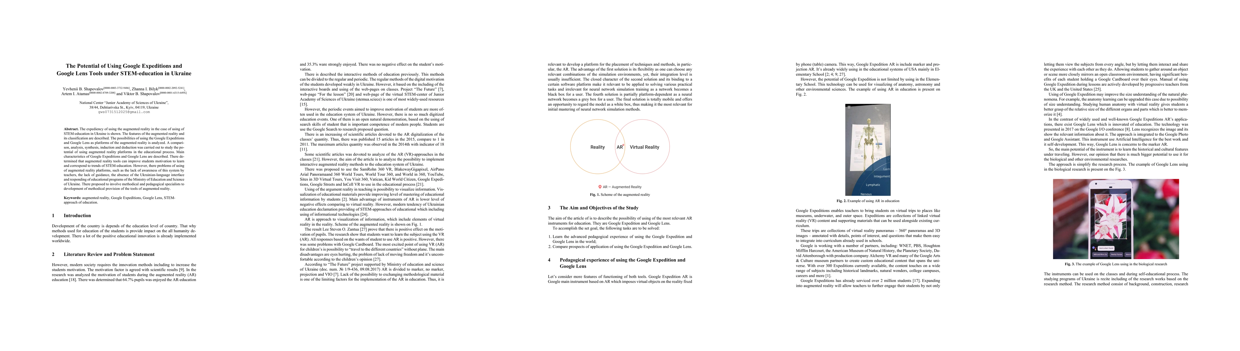 This paper explores the potential of augmented reality tools like Google Expeditions and Google Lens in enhancing STEM education in Ukraine, highlighting their benefits in improving student motivation. It identifies challenges such as teacher awareness, lack of guidance, and absence of a Ukrainian-language interface, and recommends involving specialists to develop appropriate educational methodologies.