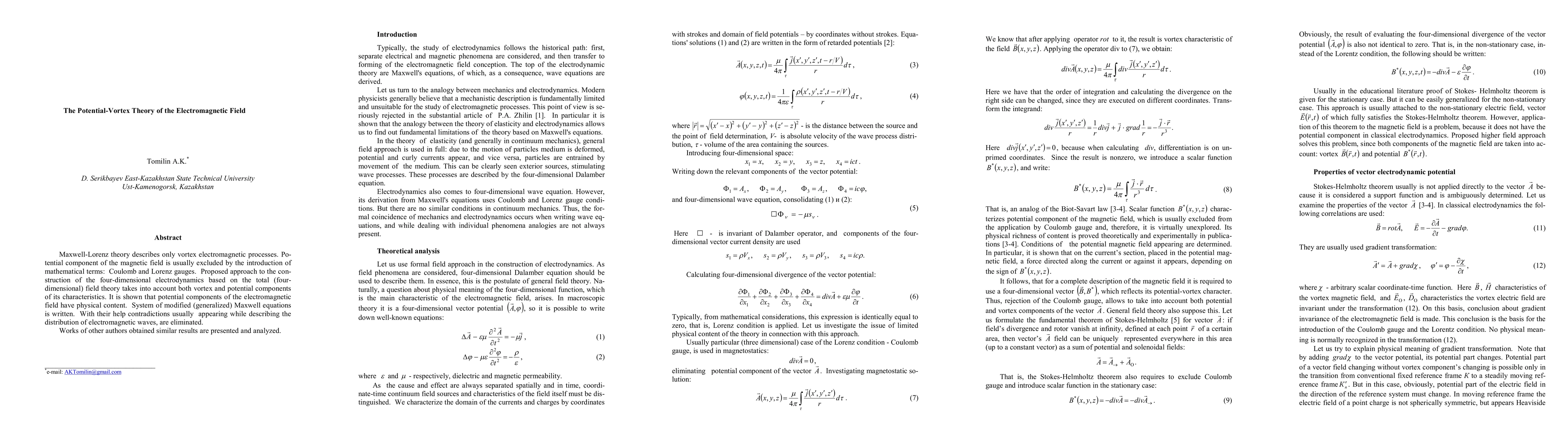 This paper proposes a four-dimensional electrodynamics theory that considers both vortex and potential components of the electromagnetic field, eliminating contradictions in wave distribution. It presents a modified set of Maxwell equations and discusses how this approach aligns with findings from other researchers.