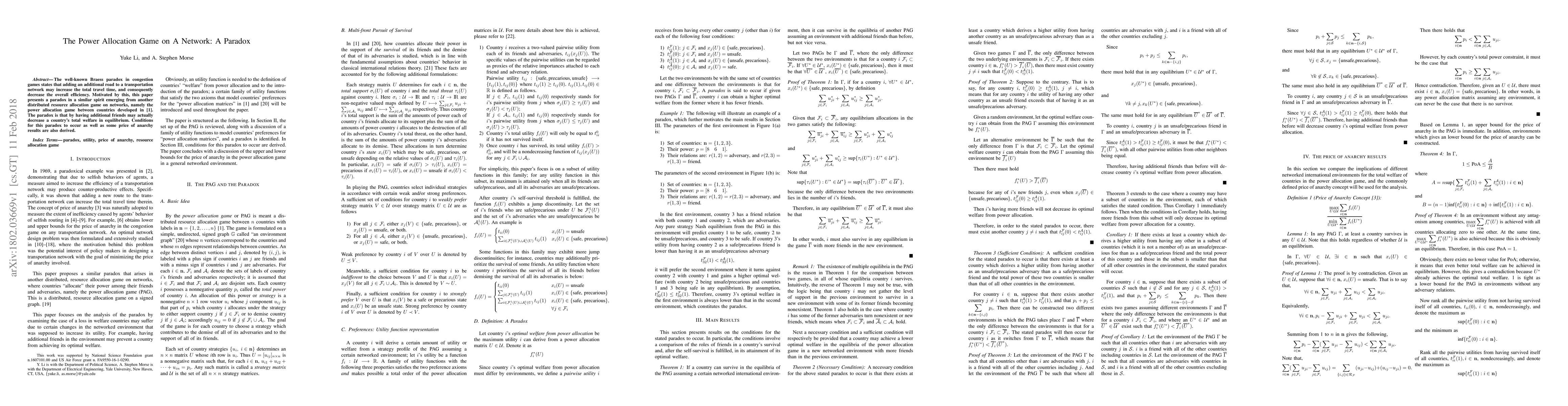 This paper explores a paradox in power allocation games on networks, where the addition of more connections (friends) can paradoxically decrease a country's total welfare in equilibrium, akin to the Braess paradox in congestion games. It also derives conditions for this paradox and examines price of anarchy results.
