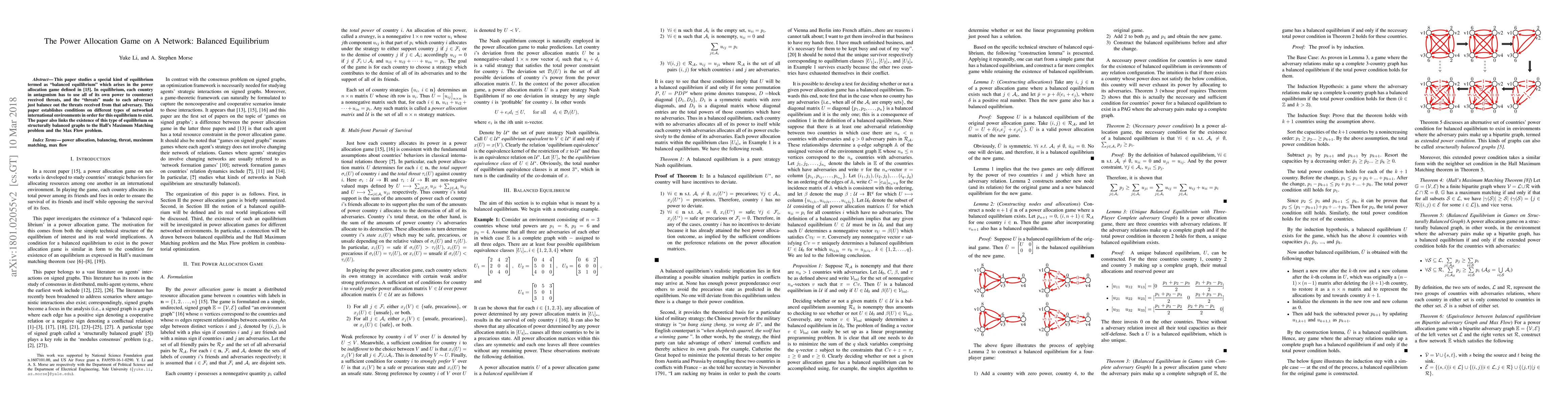 This paper studies a special kind of equilibrium termed as "balanced equilibrium" which arises in the power allocation game defined in \cite{allocation}. In equilibrium, each country in antagonism has to use all of its own power to counteract received threats, and the "threats" made to each adversary just balance out the threats received from that adversary. This paper establishes conditions on different types of networked international environments in order for this equilibrium to exist. The paper also links the existence of this type of equilibrium on structurally balanced graphs to the Hall's Maximum Matching problem and the Max Flow problem.