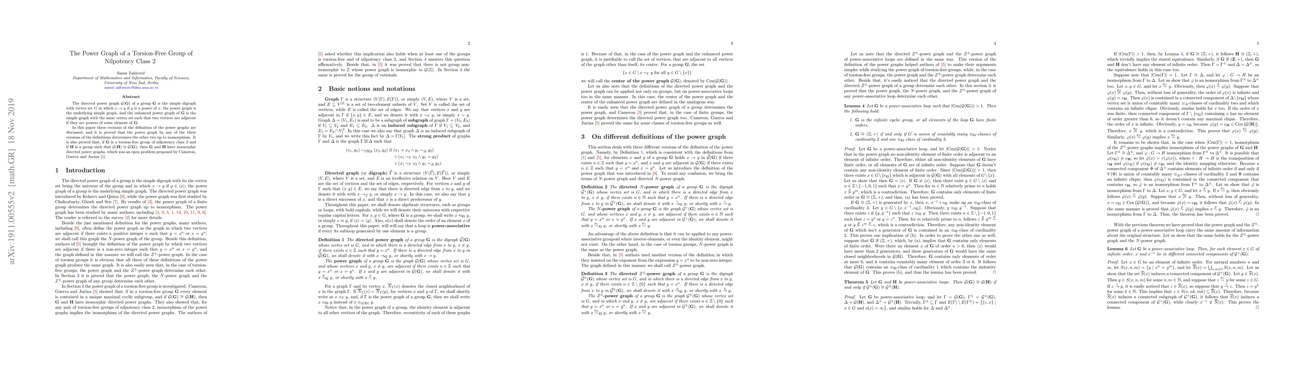 The directed power graph $\mathcal G(\mathbf G)$ of a group $\mathbf G$ is the simple digraph with vertex set $G$ in which $x\rightarrow y$ if $y$ is a power of $x$, the power graph is the underlying simple graph, and the enhanced power graph of $\mathbf G$ is the simple graph with the same vertex set such that two vertices are adjacent if they are powers of some element of $\mathbf G$. In this paper three versions of the definition of the power graphs are discussed, and it is proved that the power graph by any of the three versions of the definitions determines the other two up to isomorphism. It is also proved that, if $\mathbf G$ is a torsion-free group of nilpotency class $2$ and if $\mathbf H$ is a group such that $\mathcal G(\mathbf H)\cong\mathcal G(\mathbf G)$, then $\mathbf G$ and $\mathbf H$ have isomorphic directed power graphs, which was an open problem proposed by Cameron, Guerra and Jurina.