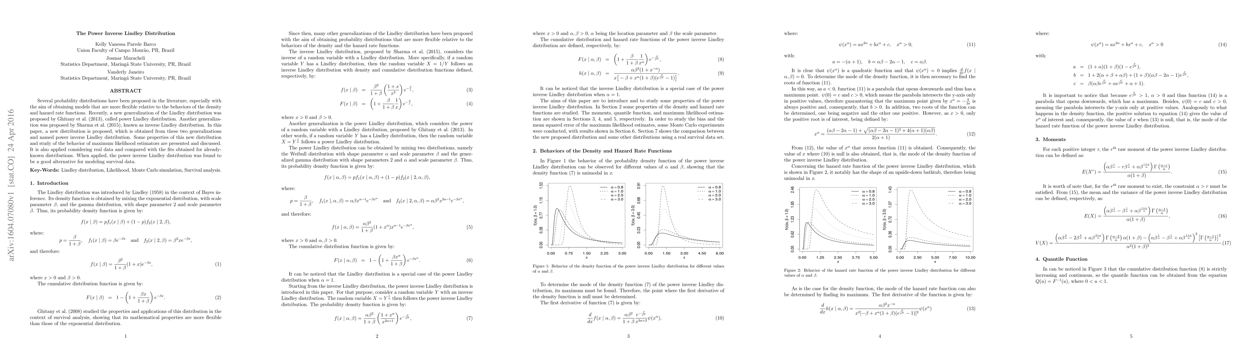 Several probability distributions have been proposed in the literature, especially with the aim of obtaining models that are more flexible relative to the behaviors of the density and hazard rate functions. Recently, a new generalization of the Lindley distribution was proposed by Ghitany et al. (2013), called power Lindley distribution. Another generaliza- tion was proposed by Sharma et al. (2015), known as inverse Lindley distribution. In this paper, a new distribution is proposed, which is obtained from these two generalizations and named power inverse Lindley distribution. Some properties of this new distribution and study of the behavior of maximum likelihood estimators are presented and discussed. It is also applied considering real data and compared with the fits obtained for already- known distributions. When applied, the power inverse Lindley distribution was found to be a good alternative for modeling survival data.