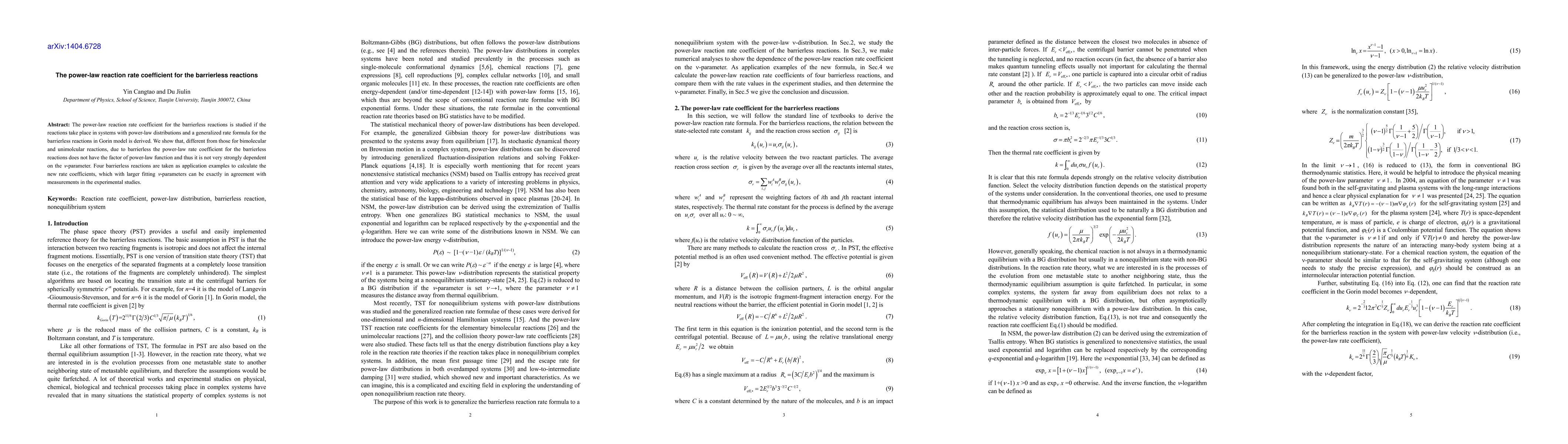 This paper derives a generalized rate formula for barrierless reactions in systems with power-law distributions, showing that the power-law reaction rate coefficient for such reactions is not strongly dependent on the nu-parameter. Four example barrierless reactions are used to demonstrate the applicability of the new rate coefficients.