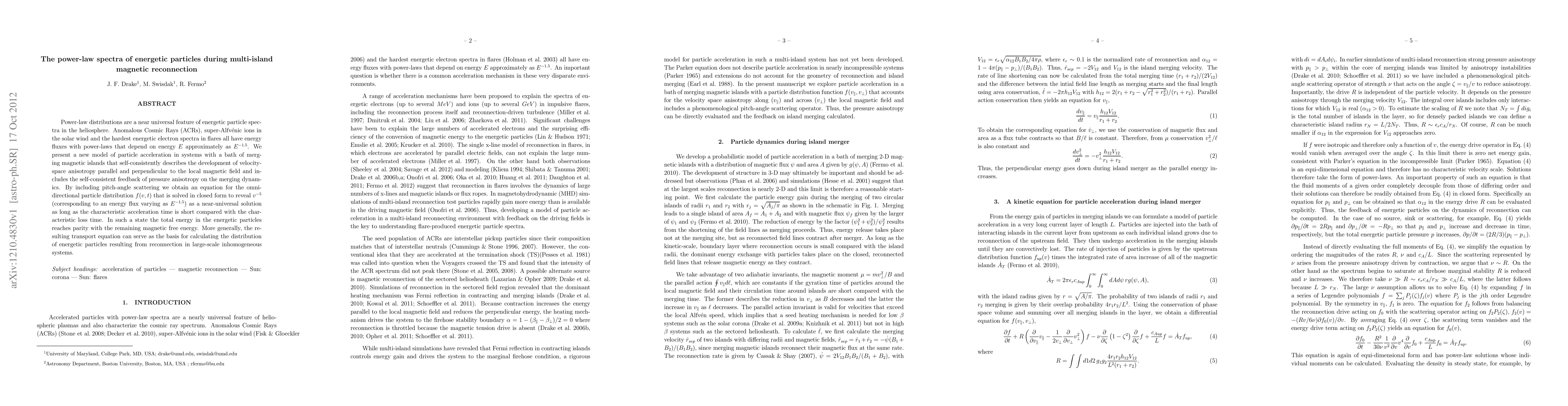 Power-law distributions are a near universal feature of energetic particle spectra in the heliosphere. Anomalous Cosmic Rays (ACRs), super-Alfv\'enic ions in the solar wind and the hardest energetic electron spectra in flares all have energy fluxes with power-laws that depend on energy $E$ approximately as $E^{-1.5}$. We present a new model of particle acceleration in systems with a bath of merging magnetic islands that self-consistently describes the development of velocity-space anisotropy parallel and perpendicular to the local magnetic field and includes the self-consistent feedback of pressure anisotropy on the merging dynamics. By including pitch-angle scattering we obtain an equation for the omni-directional particle distribution $f(v,t)$ that is solved in closed form to reveal $v^{-5}$ (corresponding to an energy flux varying as $E^{-1.5}$) as a near-universal solution as long as the characteristic acceleration time is short compared with the characteristic loss time. In such a state the total energy in the energetic particles reaches parity with the remaining magnetic free energy. More generally, the resulting transport equation can serve as the basis for calculating the distribution of energetic particles resulting from reconnection in large-scale inhomogeneous systems.
