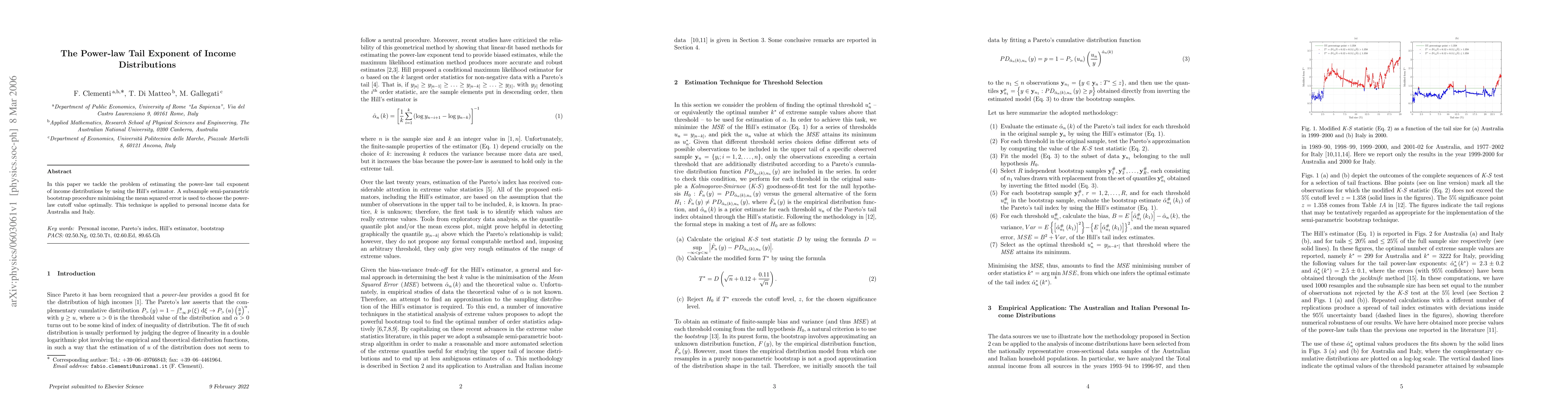 This paper estimates the power-law tail exponent of income distributions using Hill's estimator and a subsample semi-parametric bootstrap method to determine the optimal cutoff value, applied to personal income data from Australia and Italy. The chosen technique aims to minimize mean squared error for accurate estimation.