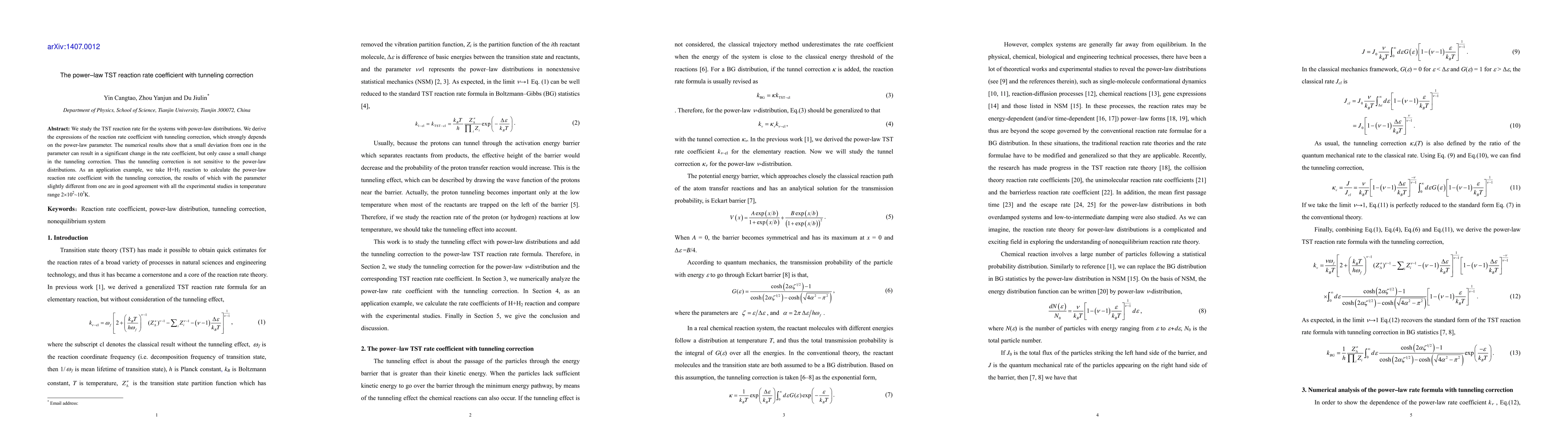 This paper derives the reaction rate coefficient for systems with power-law distributions, incorporating tunneling correction, and shows that small deviations in the power-law parameter significantly alter the rate coefficient but minimally affect the tunneling correction. The findings are validated through a hydrogen reaction example, aligning well with experimental data over a temperature range of 200-1000K.