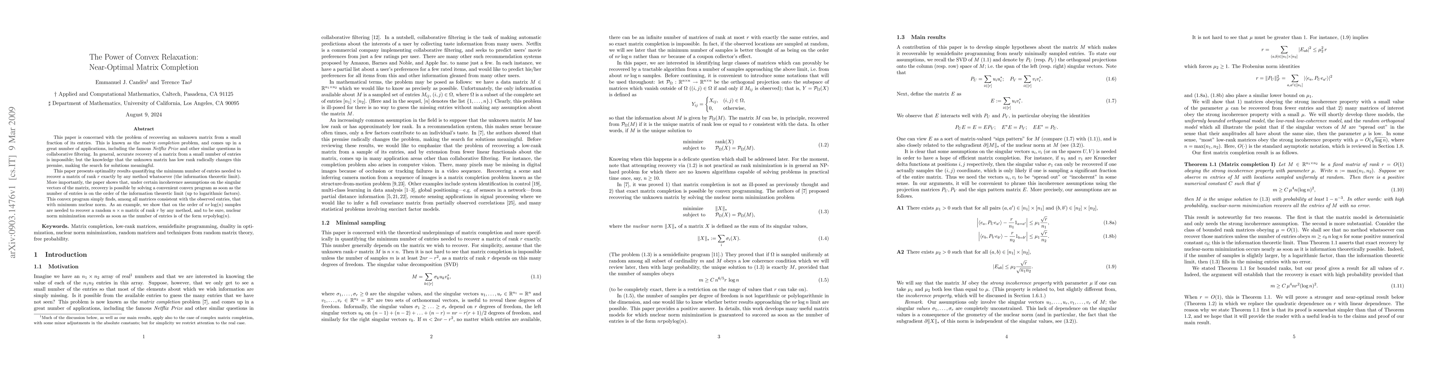This paper is concerned with the problem of recovering an unknown matrix from a small fraction of its entries. This is known as the matrix completion problem, and comes up in a great number of applications, including the famous Netflix Prize and other similar questions in collaborative filtering. In general, accurate recovery of a matrix from a small number of entries is impossible; but the knowledge that the unknown matrix has low rank radically changes this premise, making the search for solutions meaningful. This paper presents optimality results quantifying the minimum number of entries needed to recover a matrix of rank r exactly by any method whatsoever (the information theoretic limit). More importantly, the paper shows that, under certain incoherence assumptions on the singular vectors of the matrix, recovery is possible by solving a convenient convex program as soon as the number of entries is on the order of the information theoretic limit (up to logarithmic factors). This convex program simply finds, among all matrices consistent with the observed entries, that with minimum nuclear norm. As an example, we show that on the order of nr log(n) samples are needed to recover a random n x n matrix of rank r by any method, and to be sure, nuclear norm minimization succeeds as soon as the number of entries is of the form nr polylog(n).