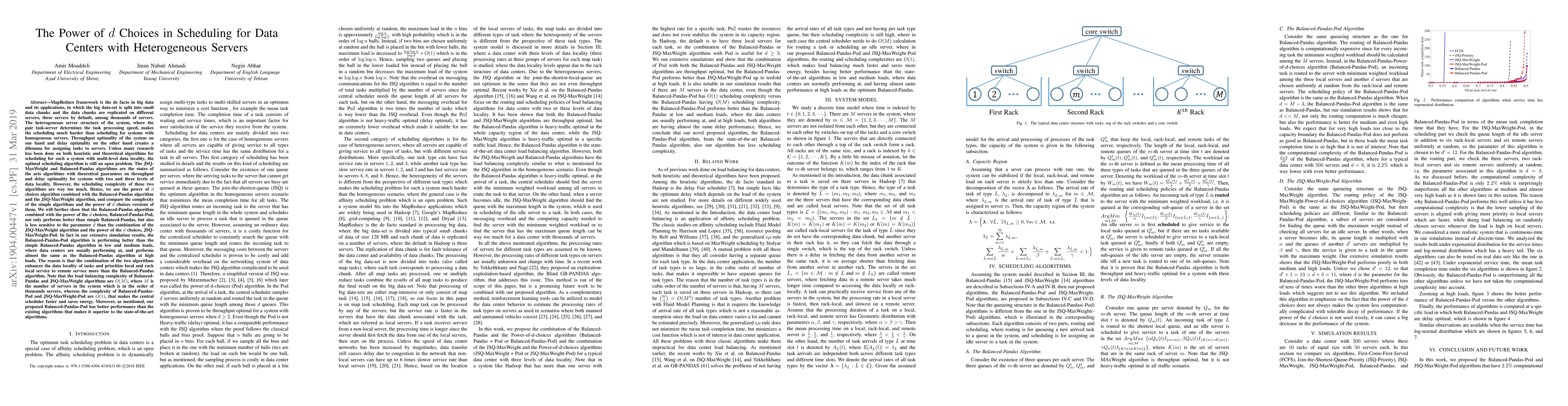 This paper proposes an enhanced scheduling algorithm, Balanced-Pandas-Pod, combining the power of $d$ choices with the Balanced-Pandas algorithm for data centers with heterogeneous servers. It demonstrates that Balanced-Pandas-Pod outperforms simple Balanced-Pandas and JSQ-MaxWeight-Pod in low to medium loads, while maintaining lower scheduling complexity.