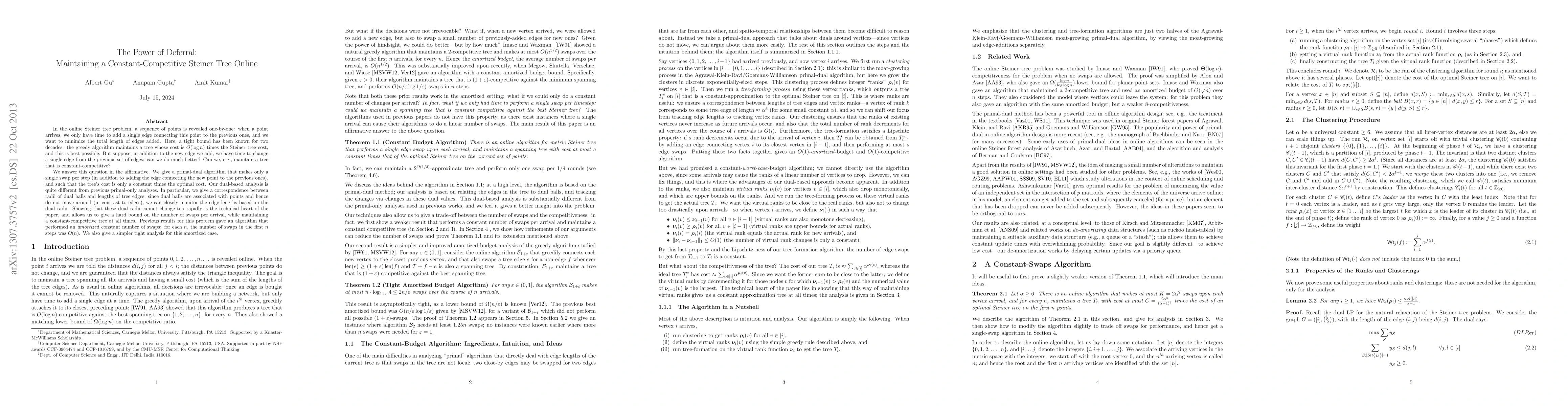 This paper proposes a primal-dual algorithm that allows a single edge swap per step to maintain a Steiner tree in the online Steiner tree problem, achieving a constant-competitive cost. This improves upon previous results that performed an amortized constant number of swaps over time.