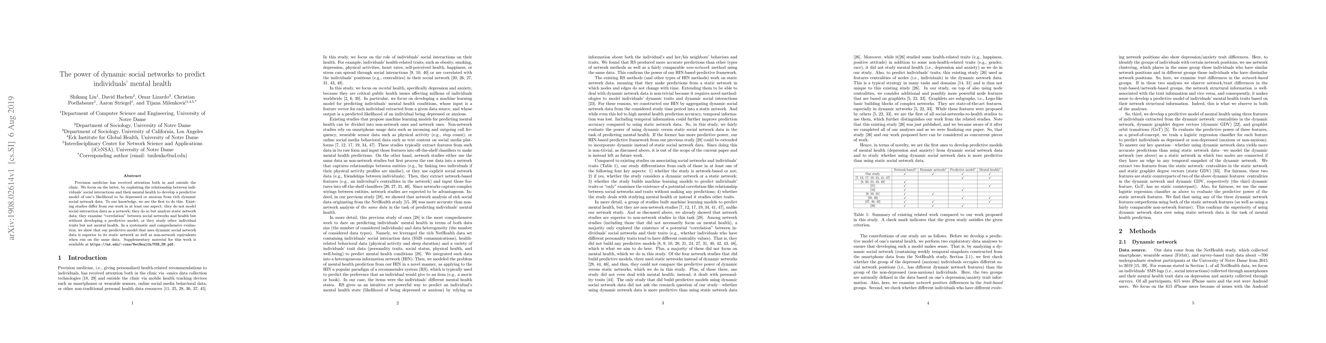 This paper develops a predictive model to forecast individuals' likelihood of depression or anxiety using dynamic social network data, demonstrating superior performance compared to static network and non-network models. The study is novel for its use of dynamic social network data to predict mental health outcomes.