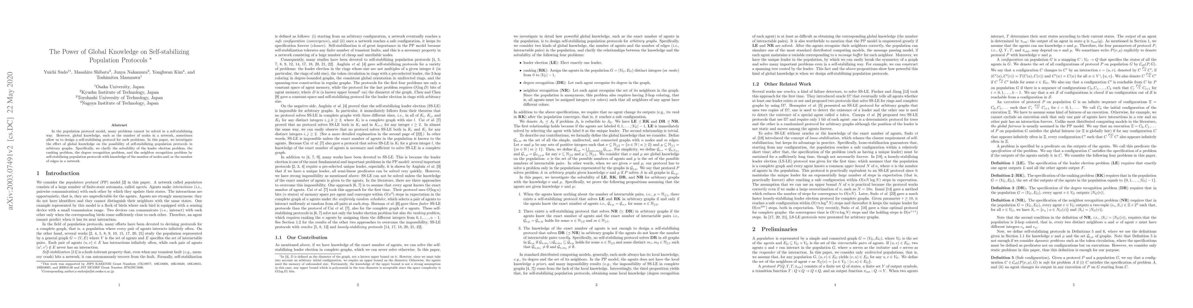This paper explores how global knowledge, such as the total number of nodes and edges in a network, can enable self-stabilizing population protocols to solve problems like leader election, ranking, degree recognition, and neighbor recognition, which are otherwise unsolvable without such information. It investigates the solvability of these problems under self-stabilizing conditions with global knowledge in arbitrary graphs.