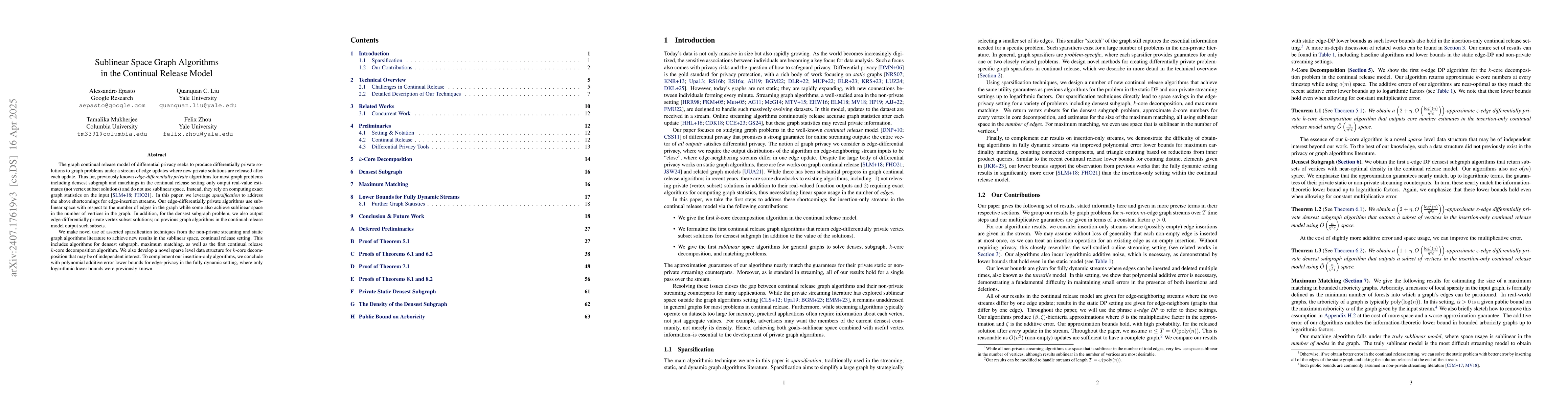 The graph continual release model of differential privacy seeks to produce differentially private solutions to graph problems under a stream of updates where new private solutions are released after each update. Streaming graph algorithms in the non-private literature also produce (approximately) accurate solutions when provided updates in a stream, but they additionally try to achieve two other goals: 1) output vertex or edge subsets as approximate solutions to the problem (not just real-valued estimates) and 2) use space that is sublinear in the number of edges or the number of vertices. Thus far, all previously known edge-differentially private algorithms for graph problems in the continual release setting do not meet the above benchmarks. Instead, they require computing exact graph statistics on the input [SLMVC18, FHO21, JSW24]. In this paper, we leverage sparsification to address the above shortcomings. Our edge-differentially private algorithms use sublinear space with respect to the number of edges in the graph while some also achieve sublinear space in the number of vertices in the graph. In addition, for most of our problems, we also output differentially private vertex subsets. We make novel use of assorted sparsification techniques from the non-private streaming and static graph algorithms literature and achieve new results in the sublinear space, continual release setting for a variety of problems including densest subgraph, $k$-core decomposition, maximum matching, and vertex cover. In addition to our edge-differential privacy results, we use graph sparsification based on arboricity to obtain a set of results in the node-differential privacy setting, illustrating a new connection between sparsification and privacy beyond minimizing space. We conclude with polynomial additive error lower bounds for edge-privacy in the fully dynamic setting.